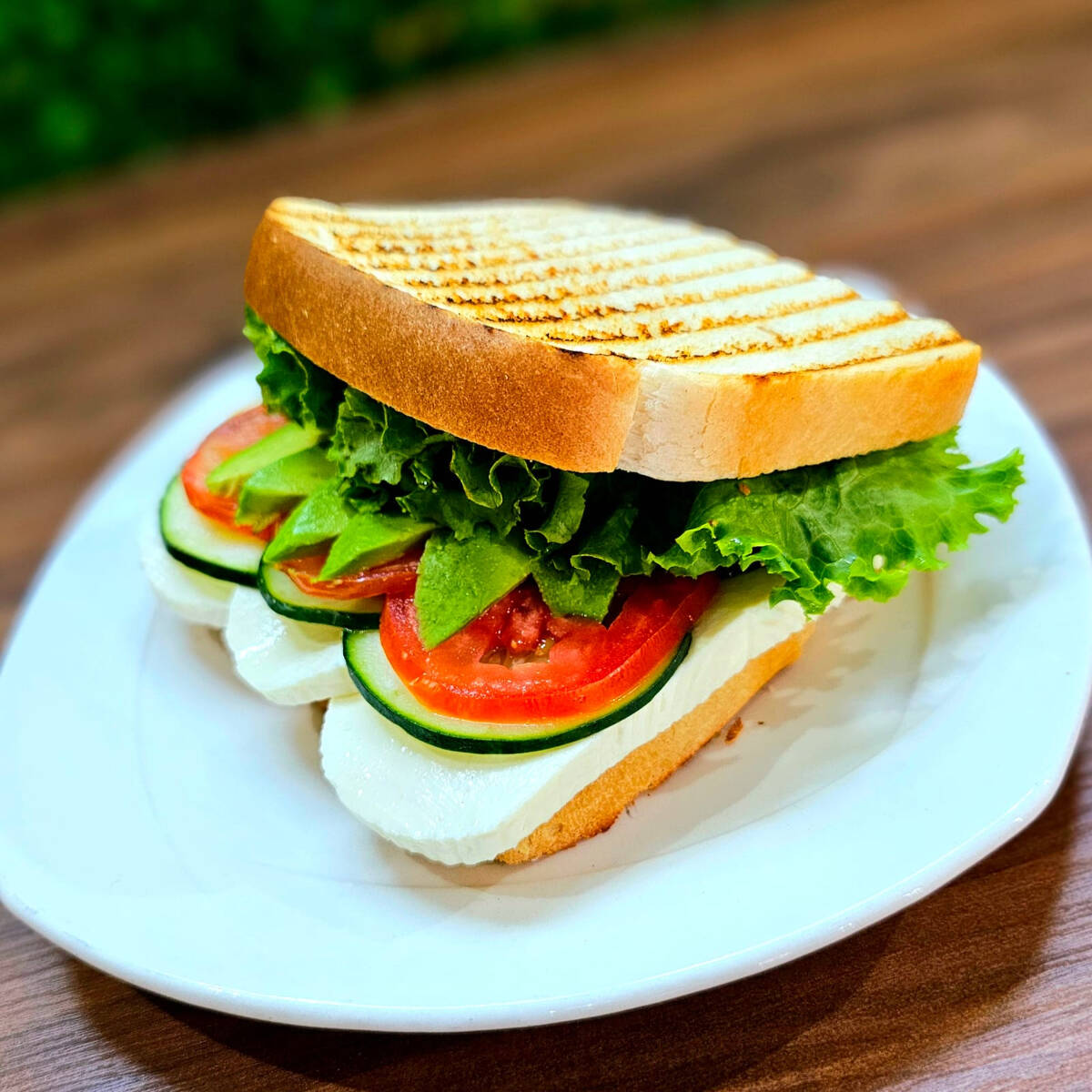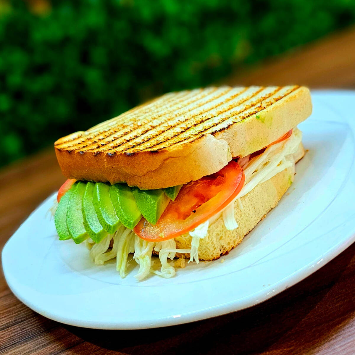Sándwich con lechuga, mayonesa, queso panela, aguacate, pepino, jitomate y picante a elegir.