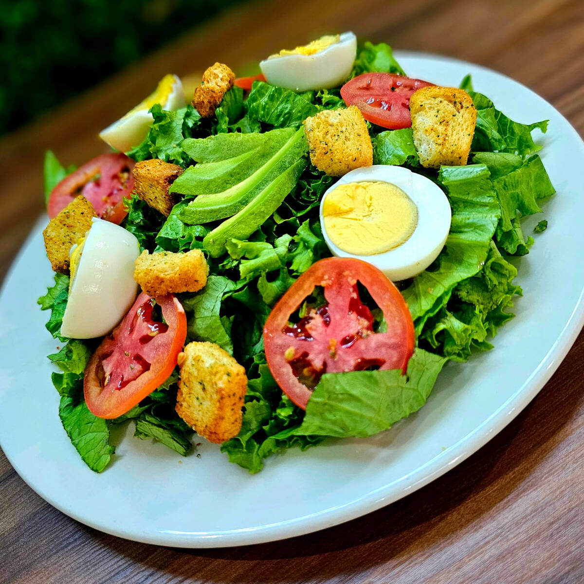 Ensalada con lechuga, aguacate, jitomate, huevo hervido, crutones, aderezo.