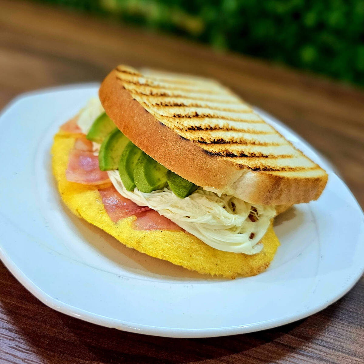Sándwich con jamón, mayonesa, lechuga, quesillo, queso amarillo, aguacate, jitomate y picante a elegir.