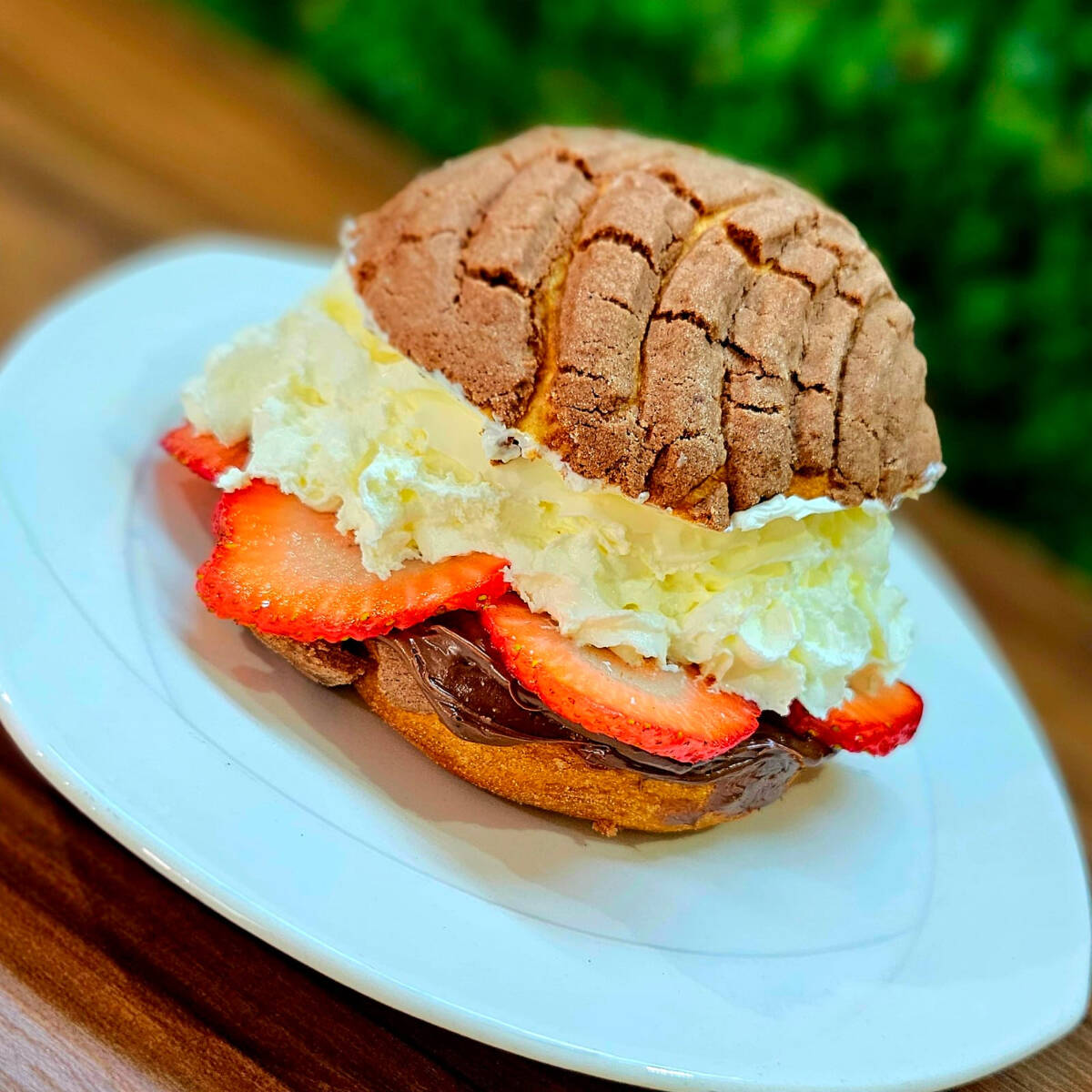 Concha Rellena con Philladelphia, Nutella, crema batida y fruta a elegir. 210 gr. aprox.