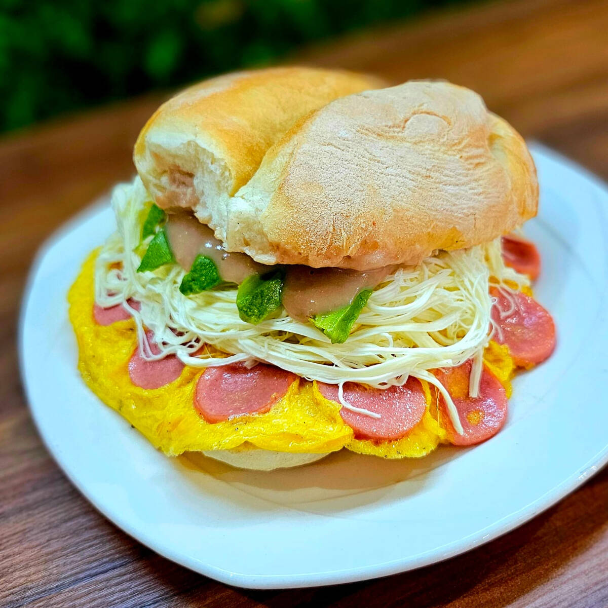 Sándwich con huevo, salchicha, mayonesa, queso manchego derretido y picante a elegir.