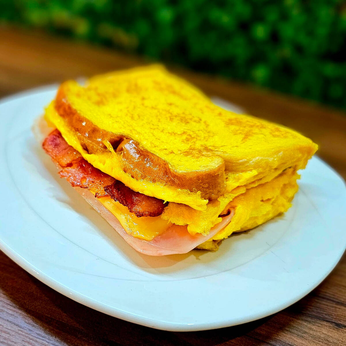 Pan cubierto de huevo y mantequilla, relleno de queso amarillo, tocino ahumado y jamón de pierna.