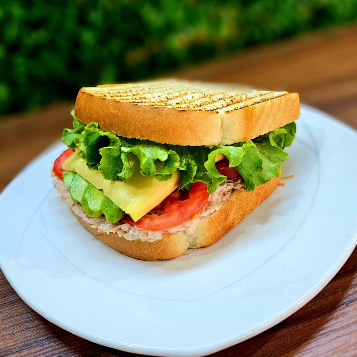 Sándwich con atún, mayonesa, lechuga, queso amarillo, aguacate, jitomate y picante a elegir.