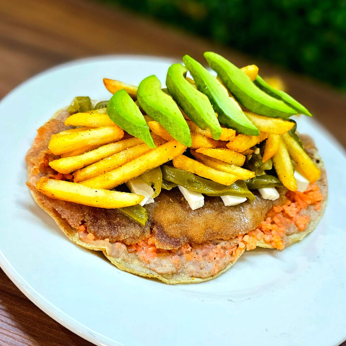 Torta con milanesa de pollo, chilaquiles con salsa a elección, quesillo, crema, aguacate, cebolla y huevo estrellado.