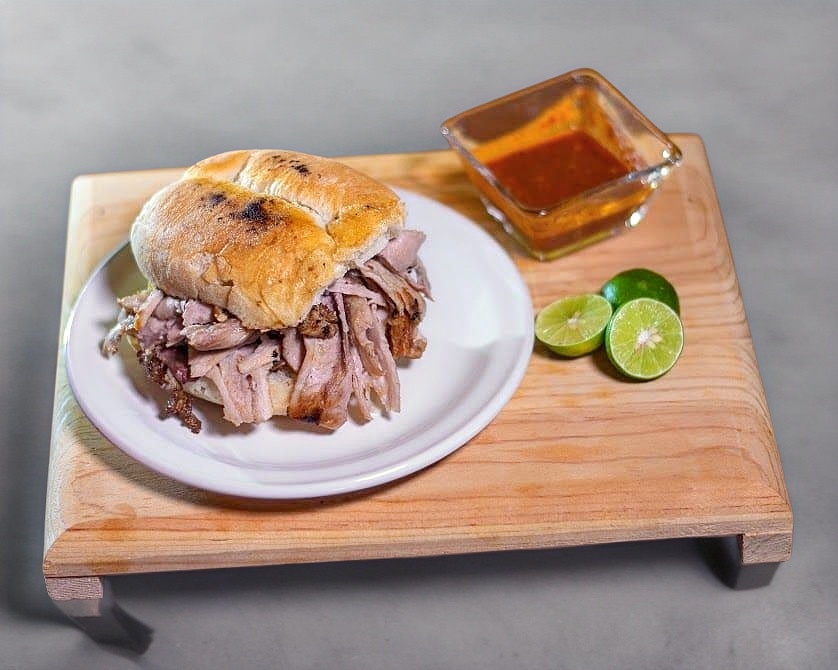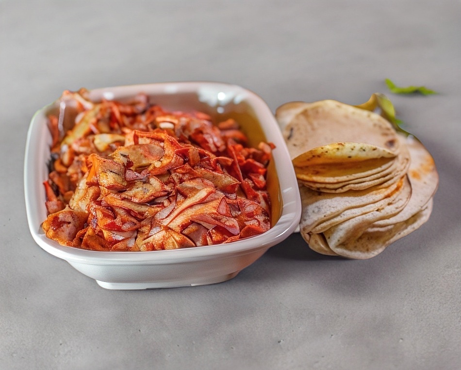 300 gramos, salsa, tortillas de maíz, pan árabe, cebolla, cilantro y piña.