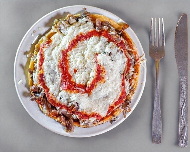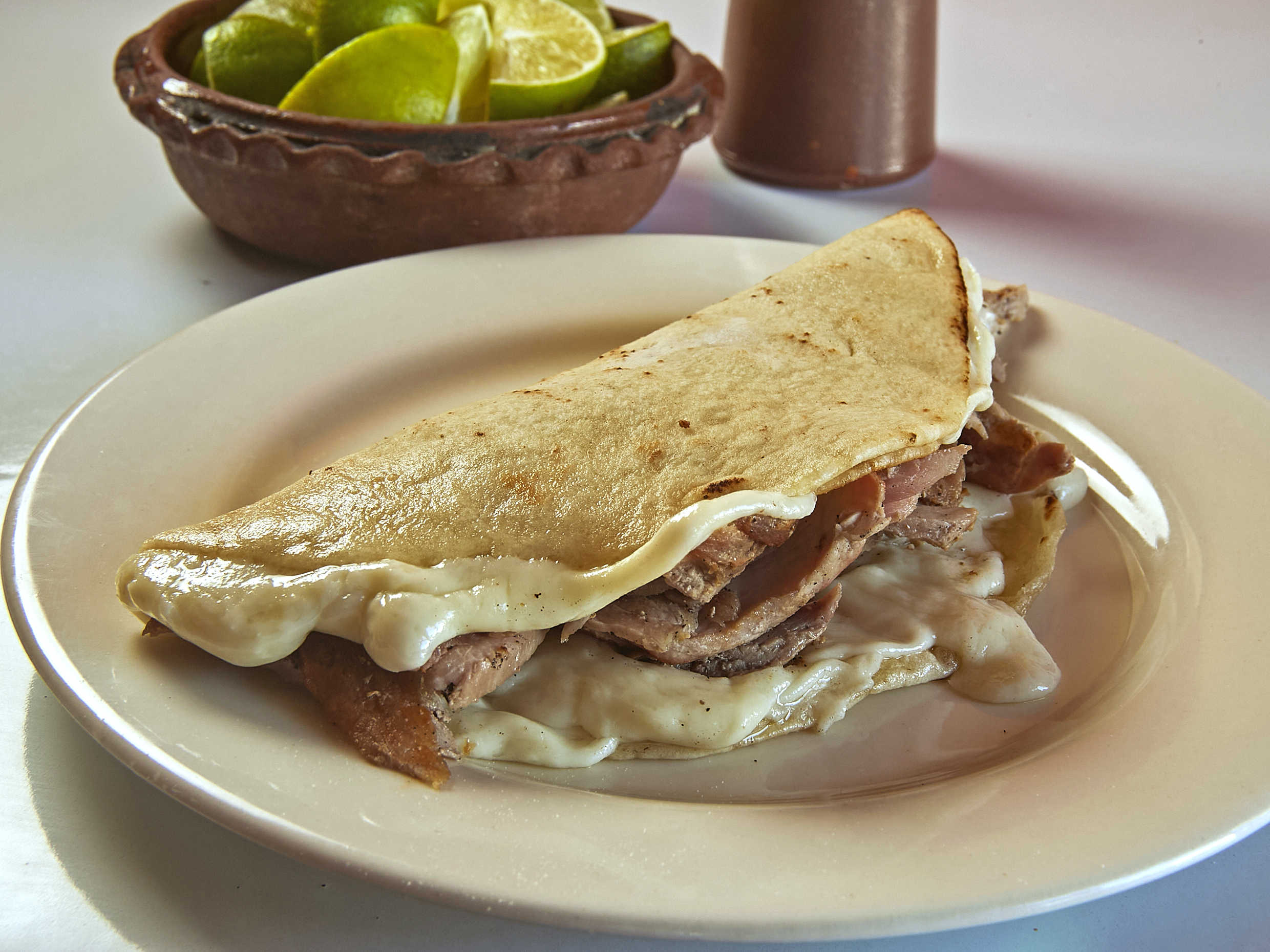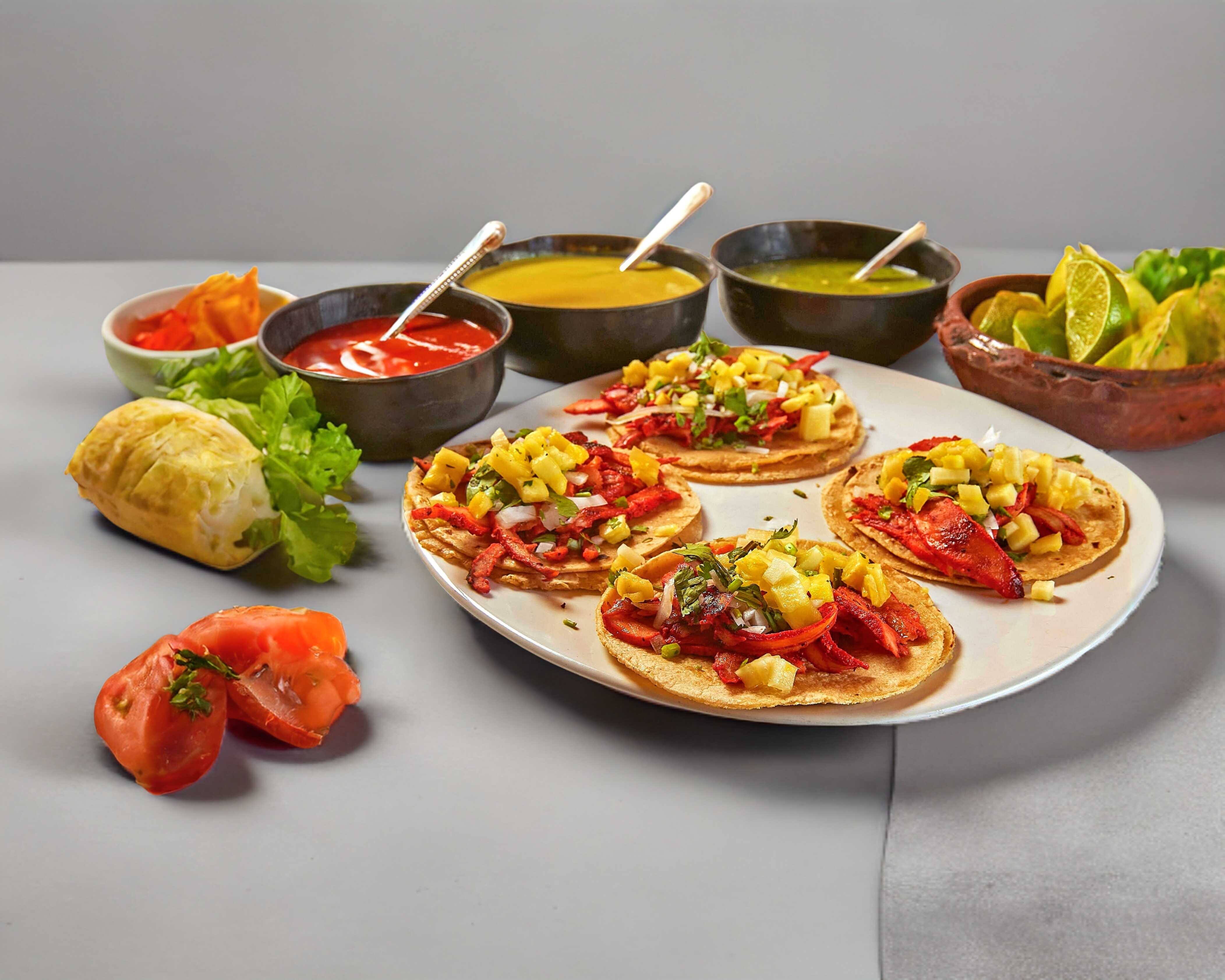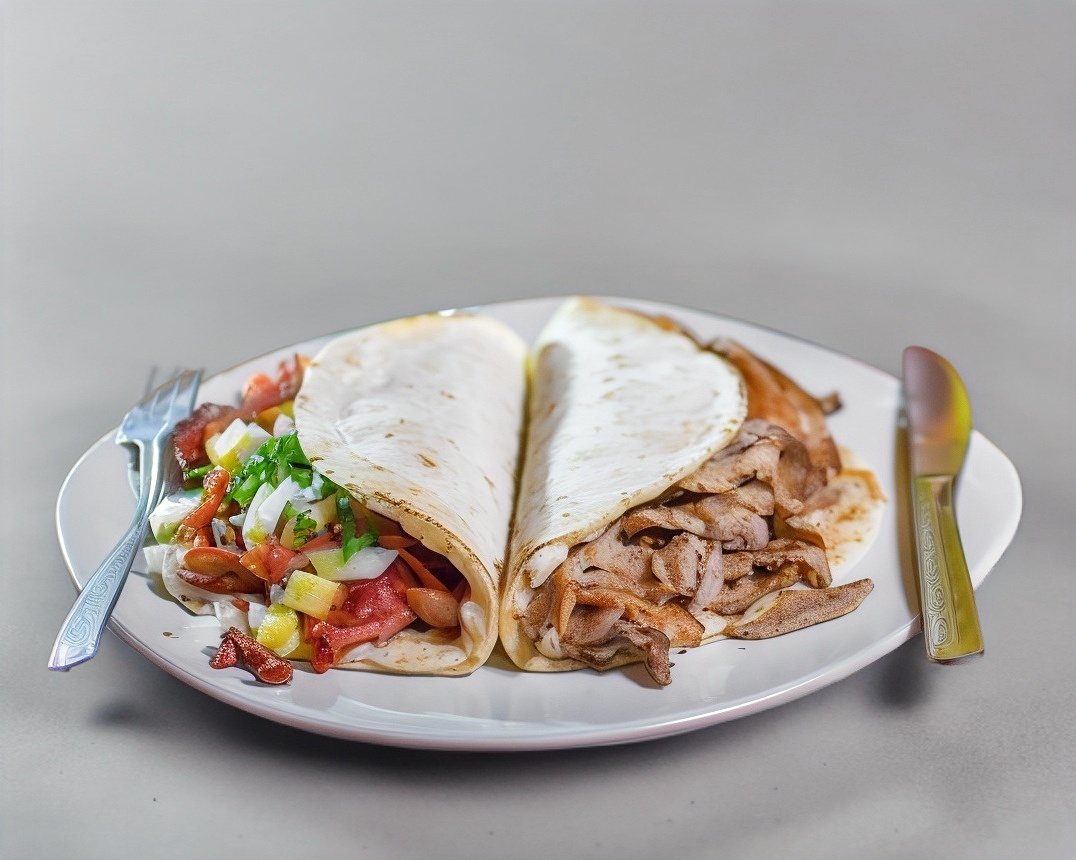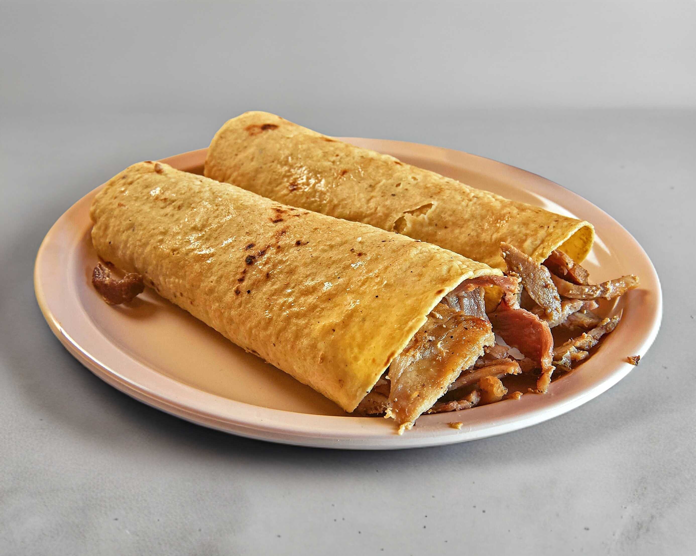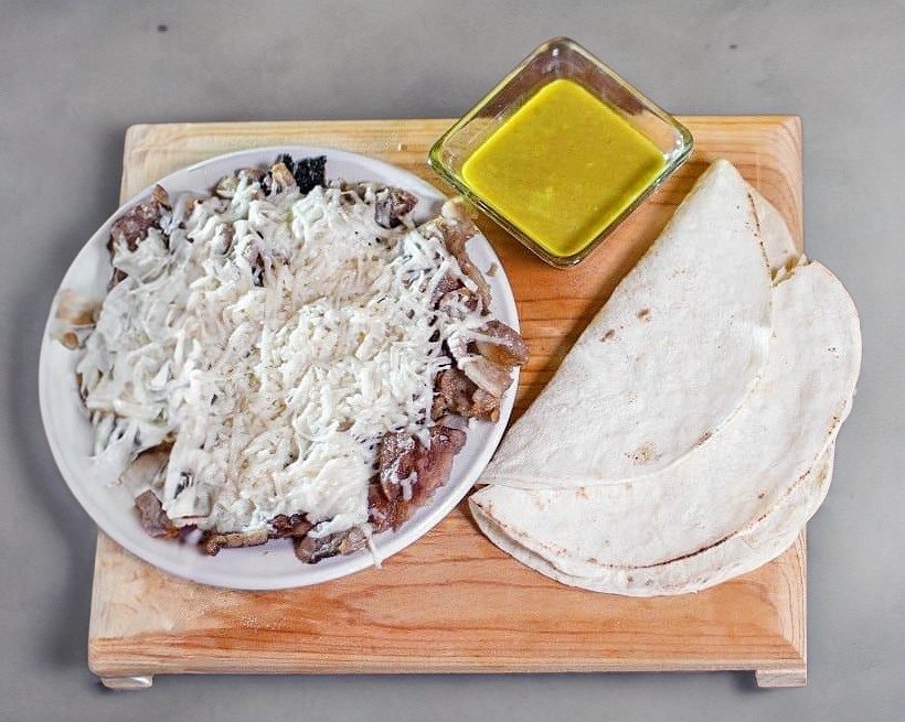 Carne al pastor, queso, tortilla de maíz y pan árabe.