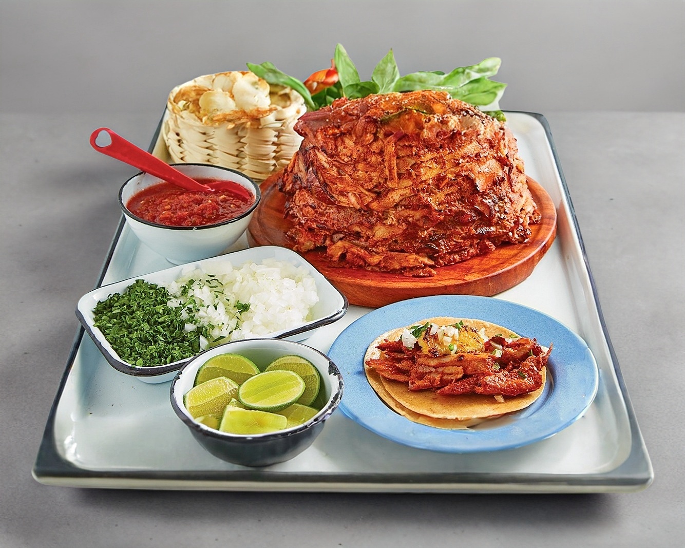 1 Kilo de carne al pastor, cebolla , piña, tortilla de maíz 10 pan árabe 3 salsas
