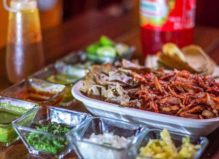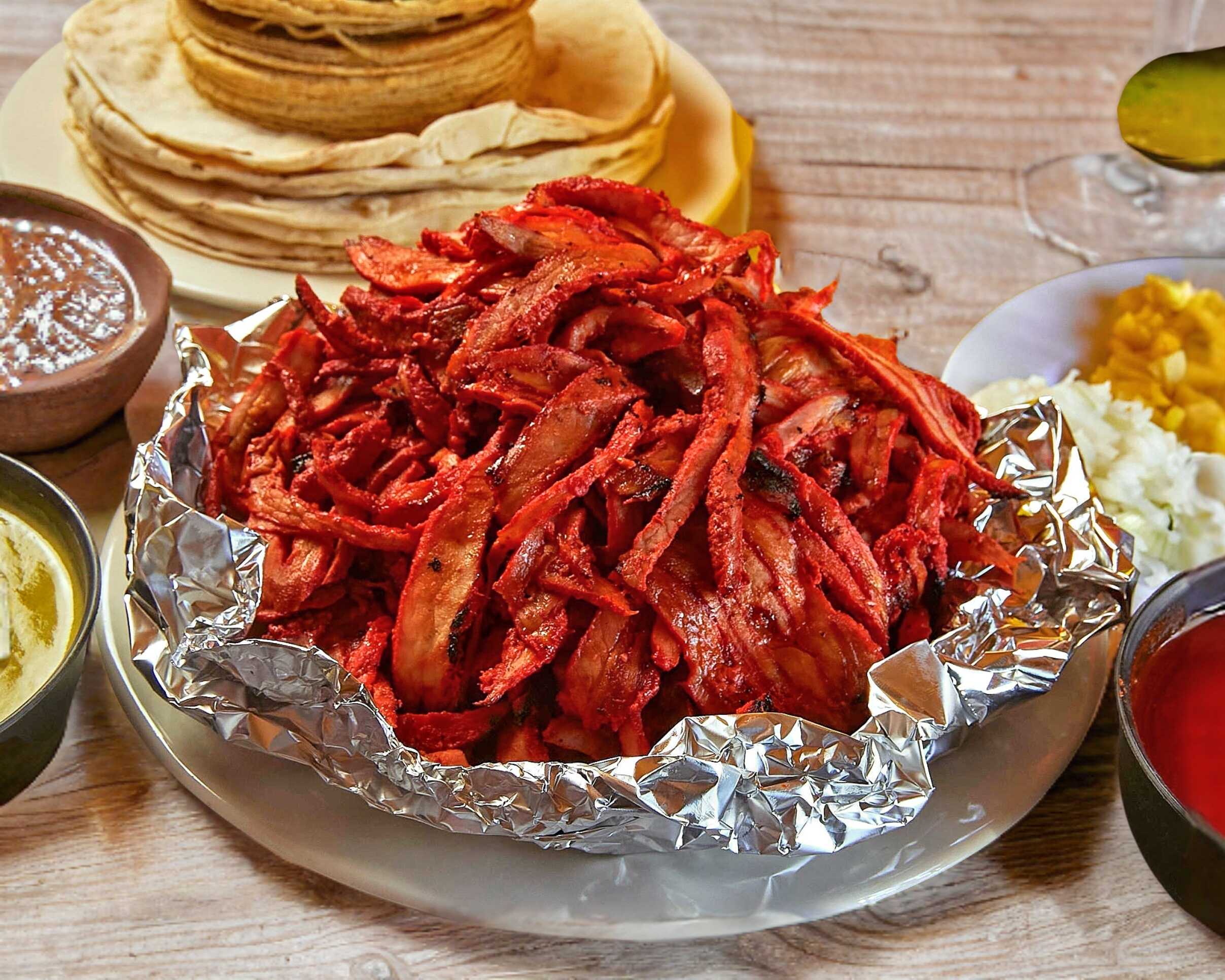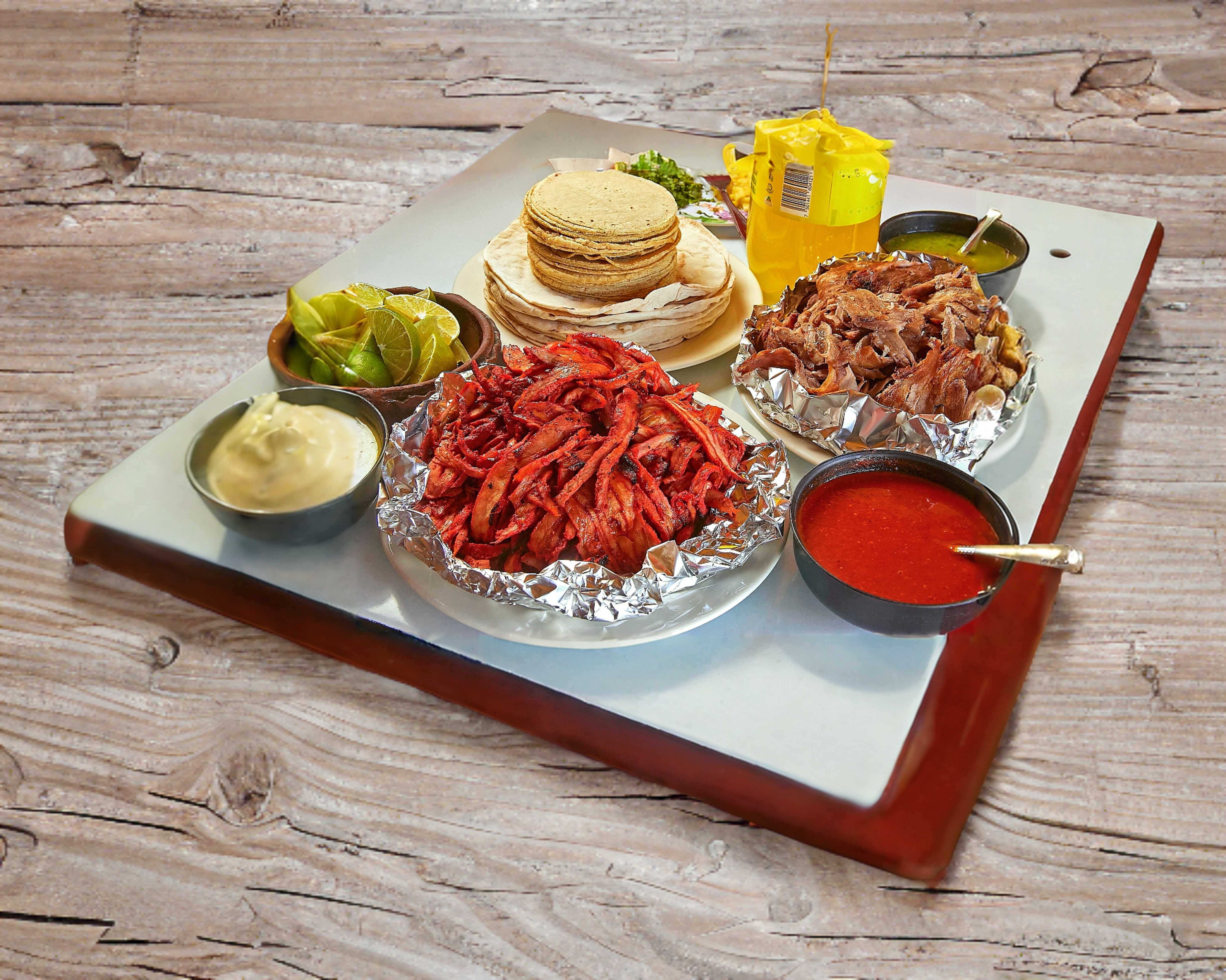 1 Kilo de Carne al Pastor, cebolla, piña, 10 tortillas de maíz, 10 Pan árabe y 3 salsas.