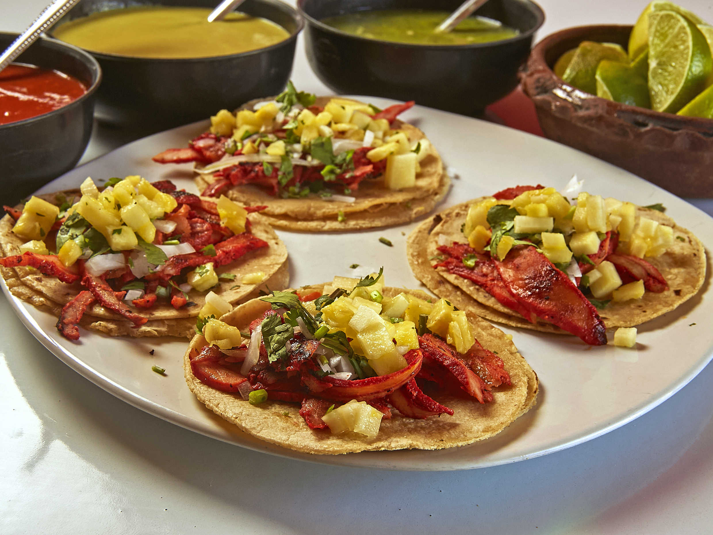 4 tacos, tortilla de maíz, cilantro, cebolla y piña.