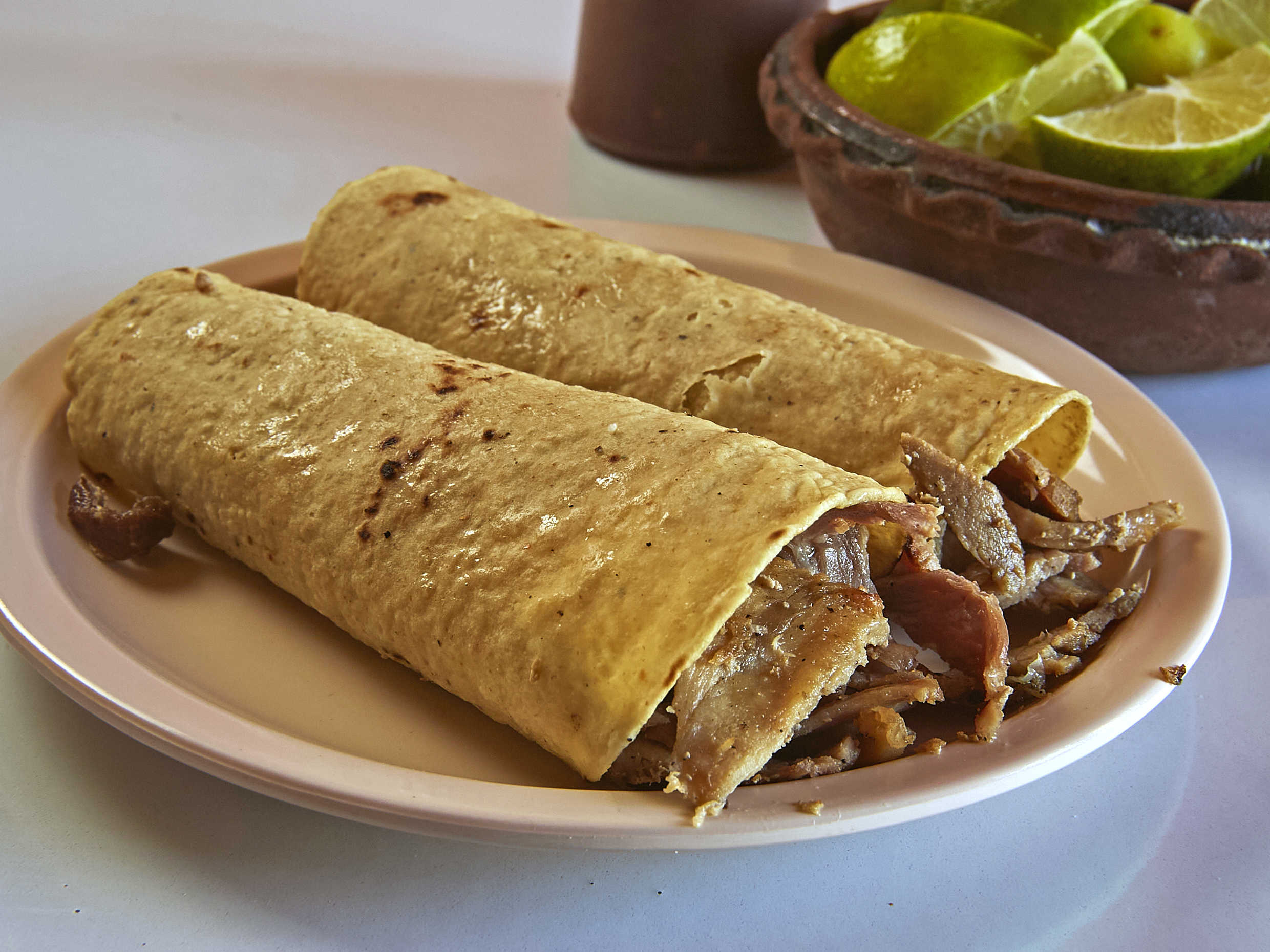 Tortilla de maíz, carne árabe.