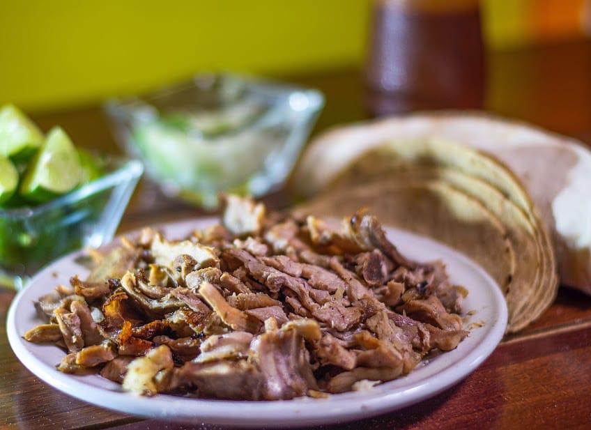 Carne al pastor, queso, tortilla de maíz y pan árabe.