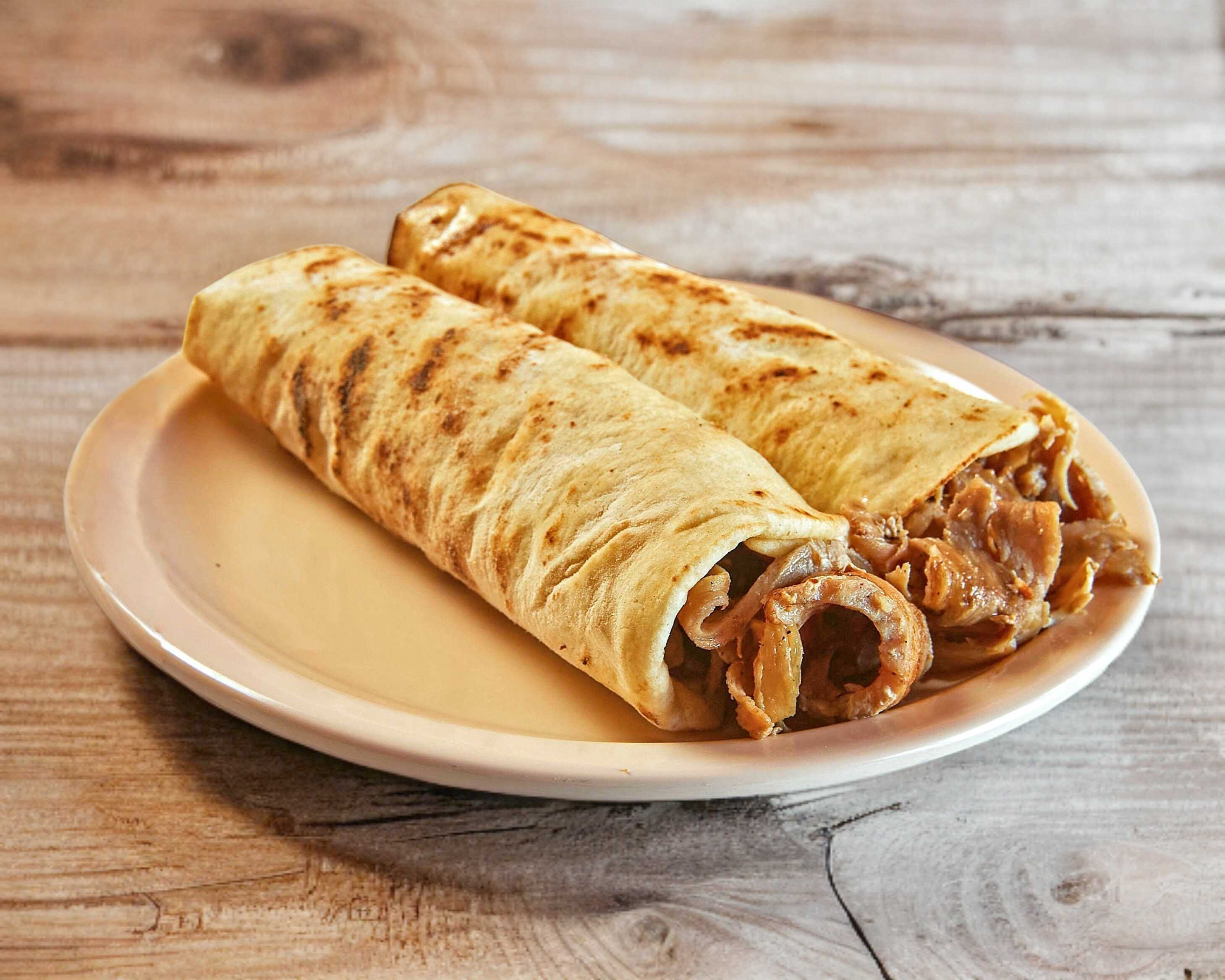 Tortilla árabe, pastor, cebolla, cilantro y piña.