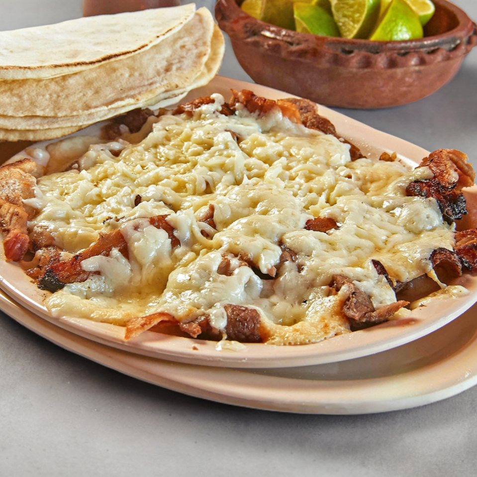Platillo individual ;Carne pastor, queso, aderezo, cebolla, cilantro, piña.