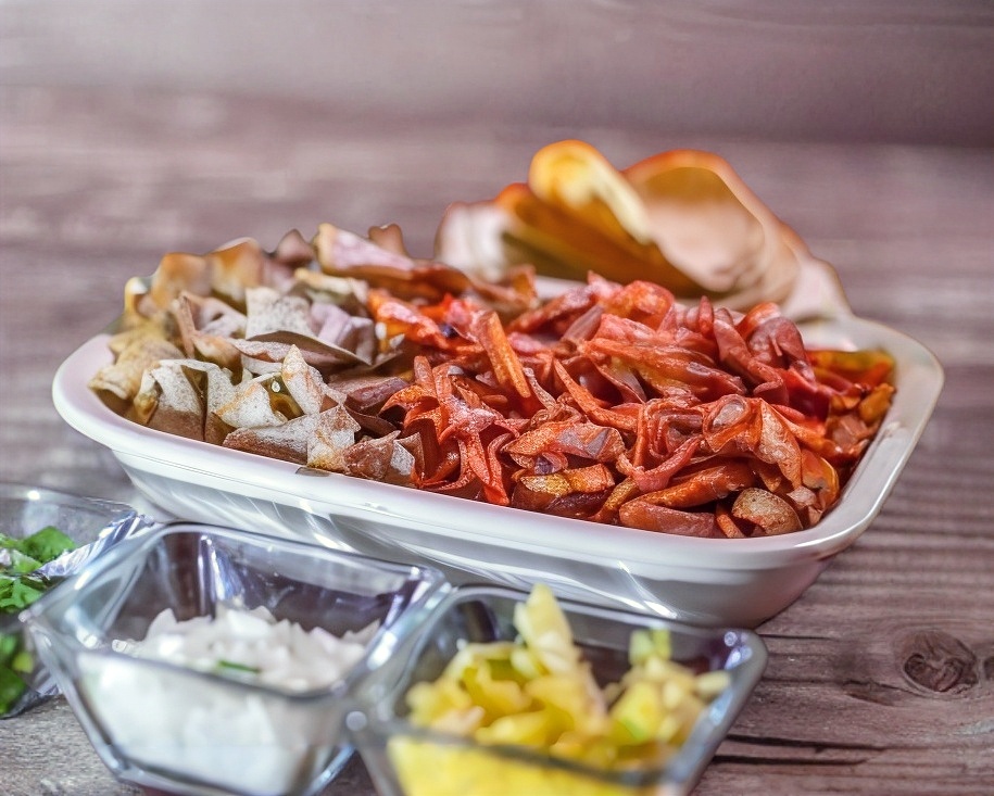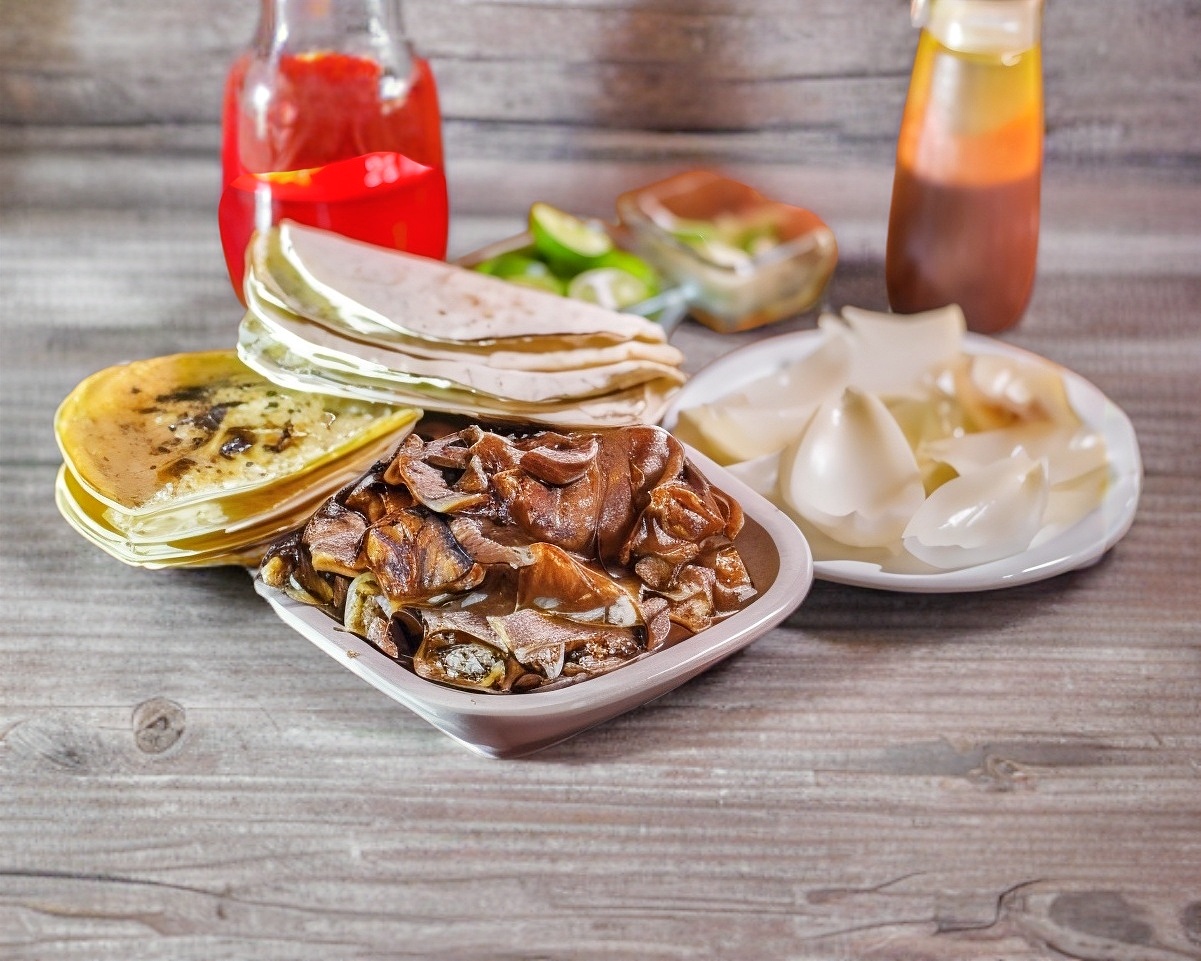 1 Kilo de Carne árabe, cebollas al vapor, salsas, 10 tortillas de maíz, 10 tortillas pan árabe.