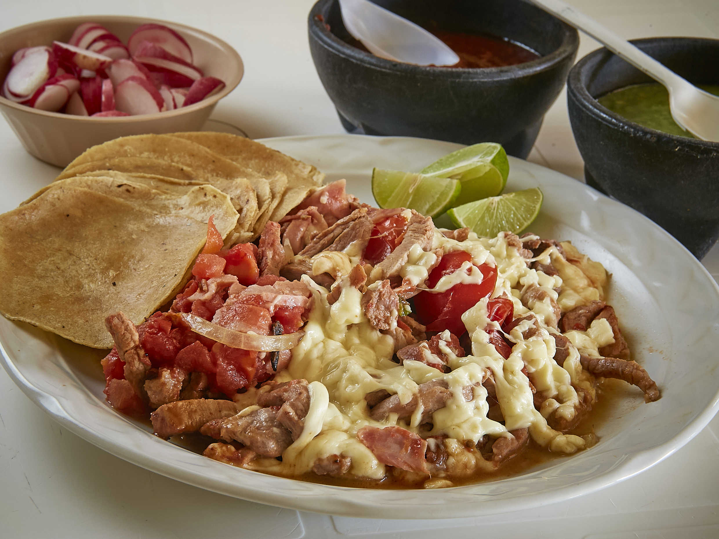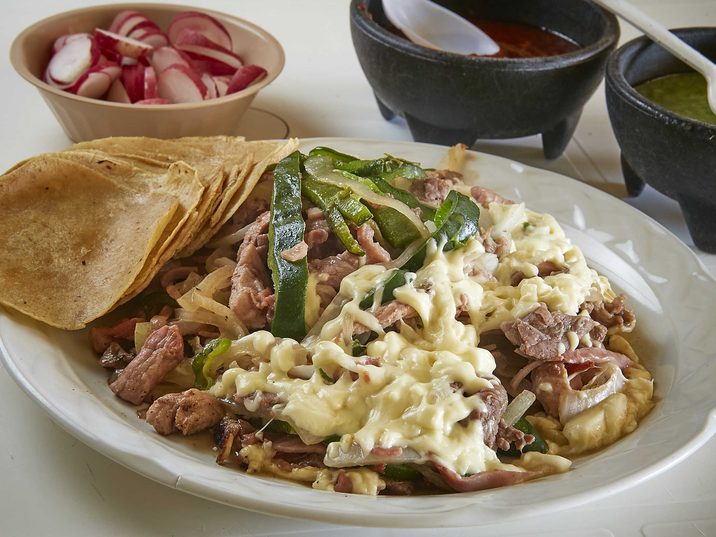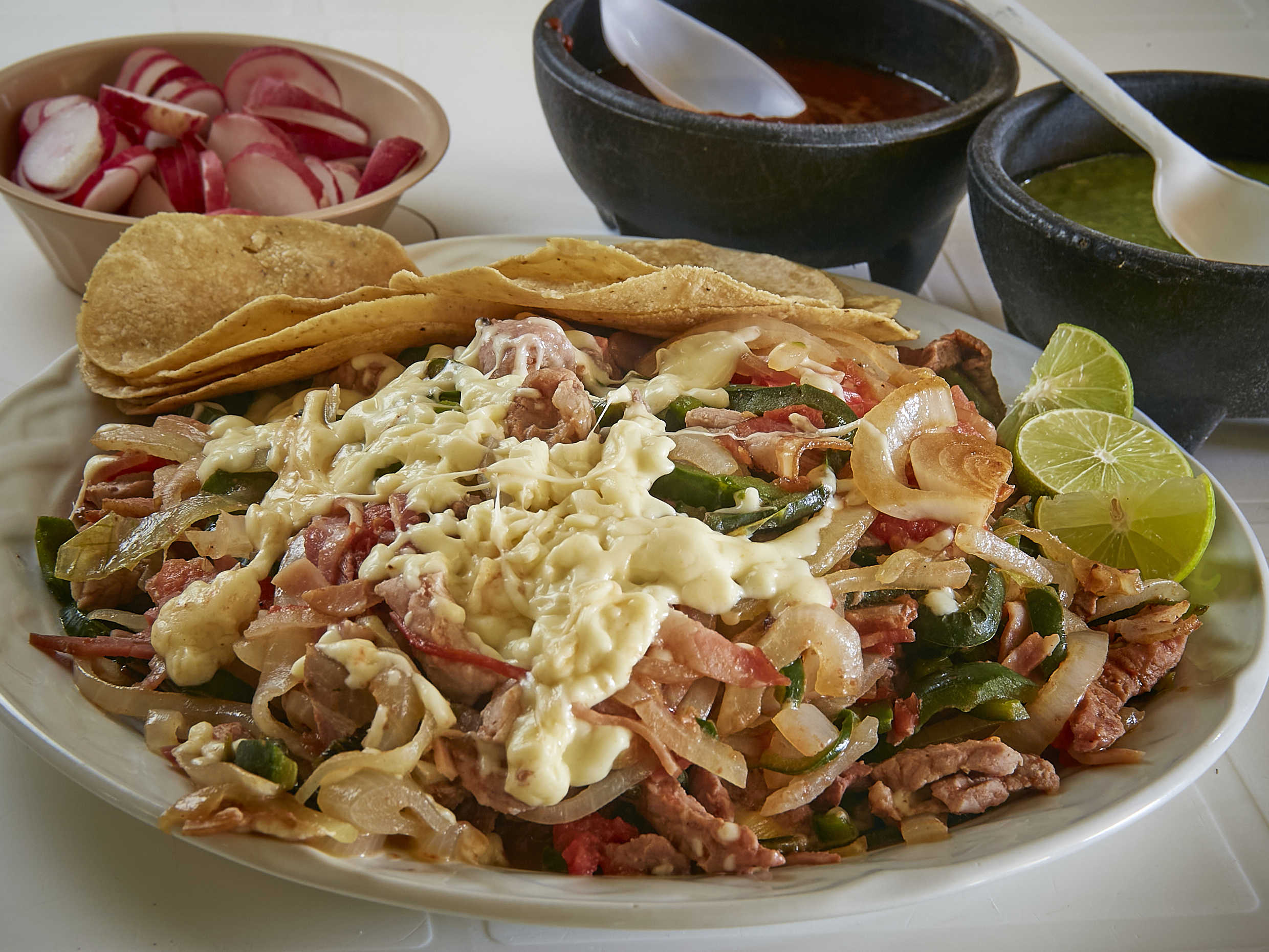 Bistec de res, 15 tortillas de maíz, chile poblano, cebolla, tocino, jamón y queso.