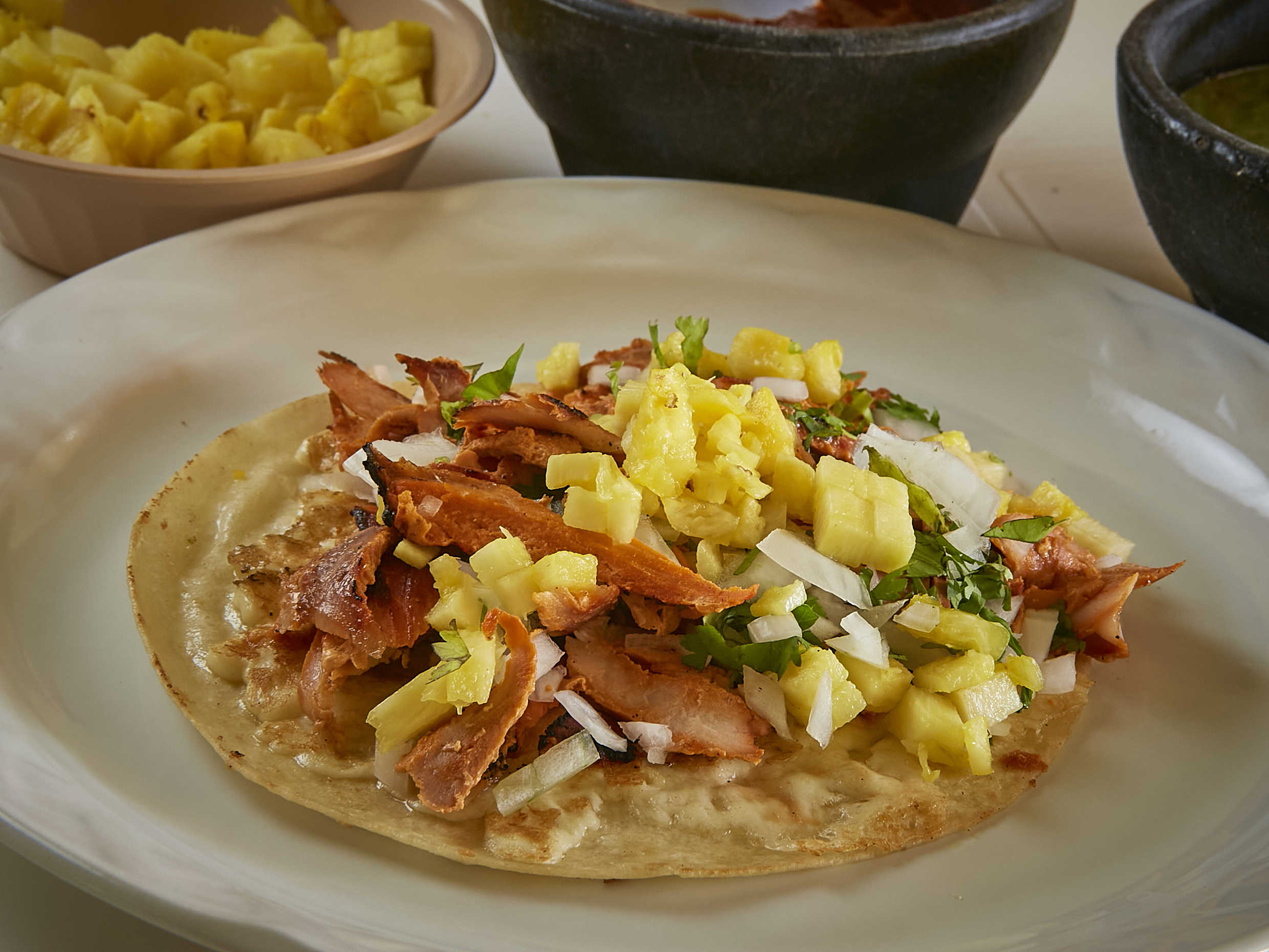 Carne al pastor, tortilla de harina, cilantro y cebolla.
