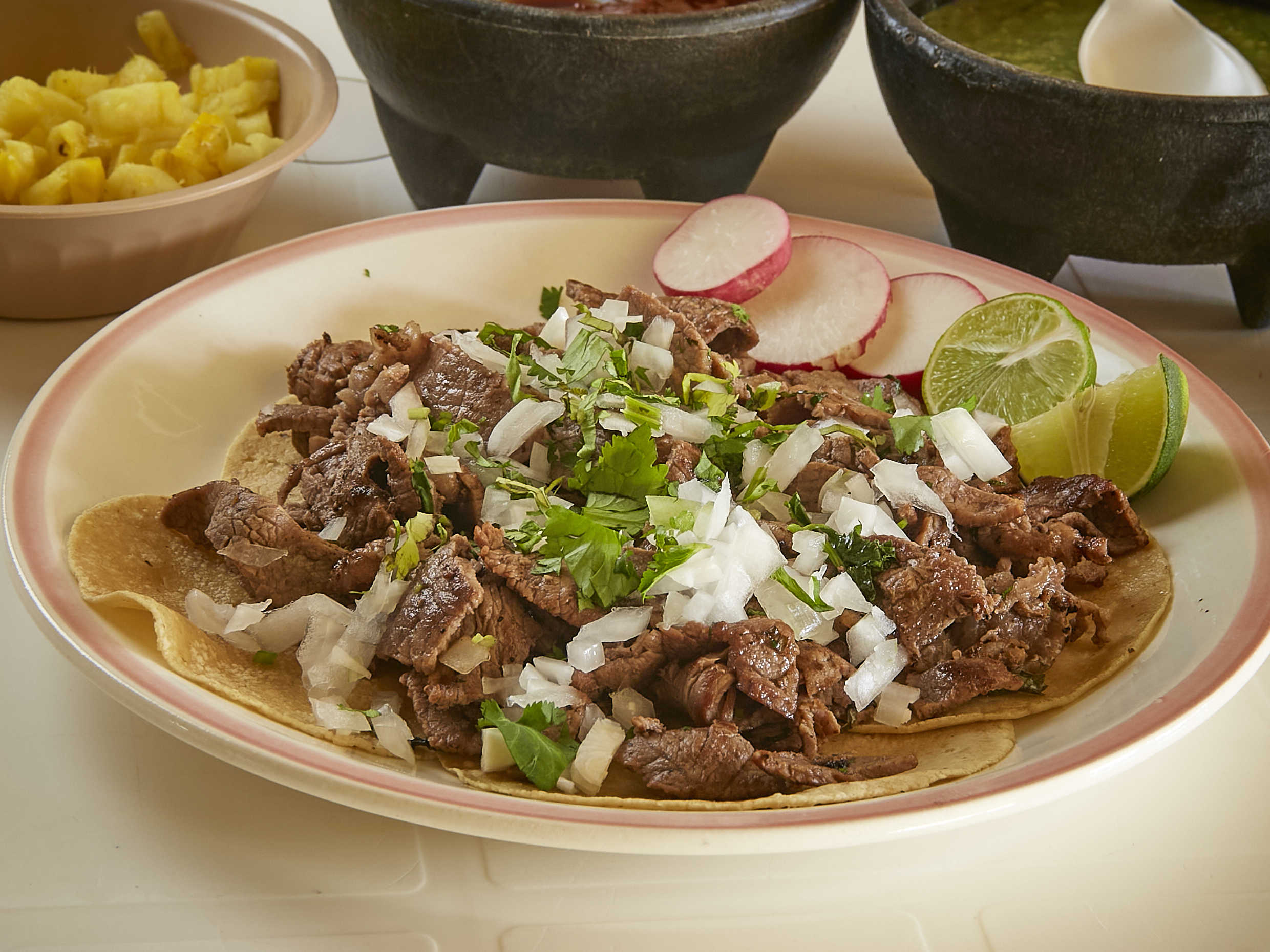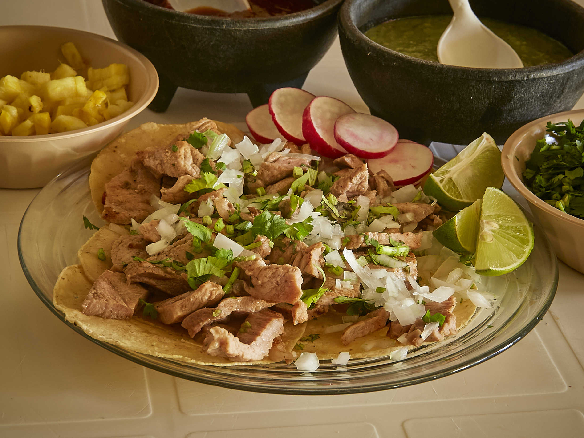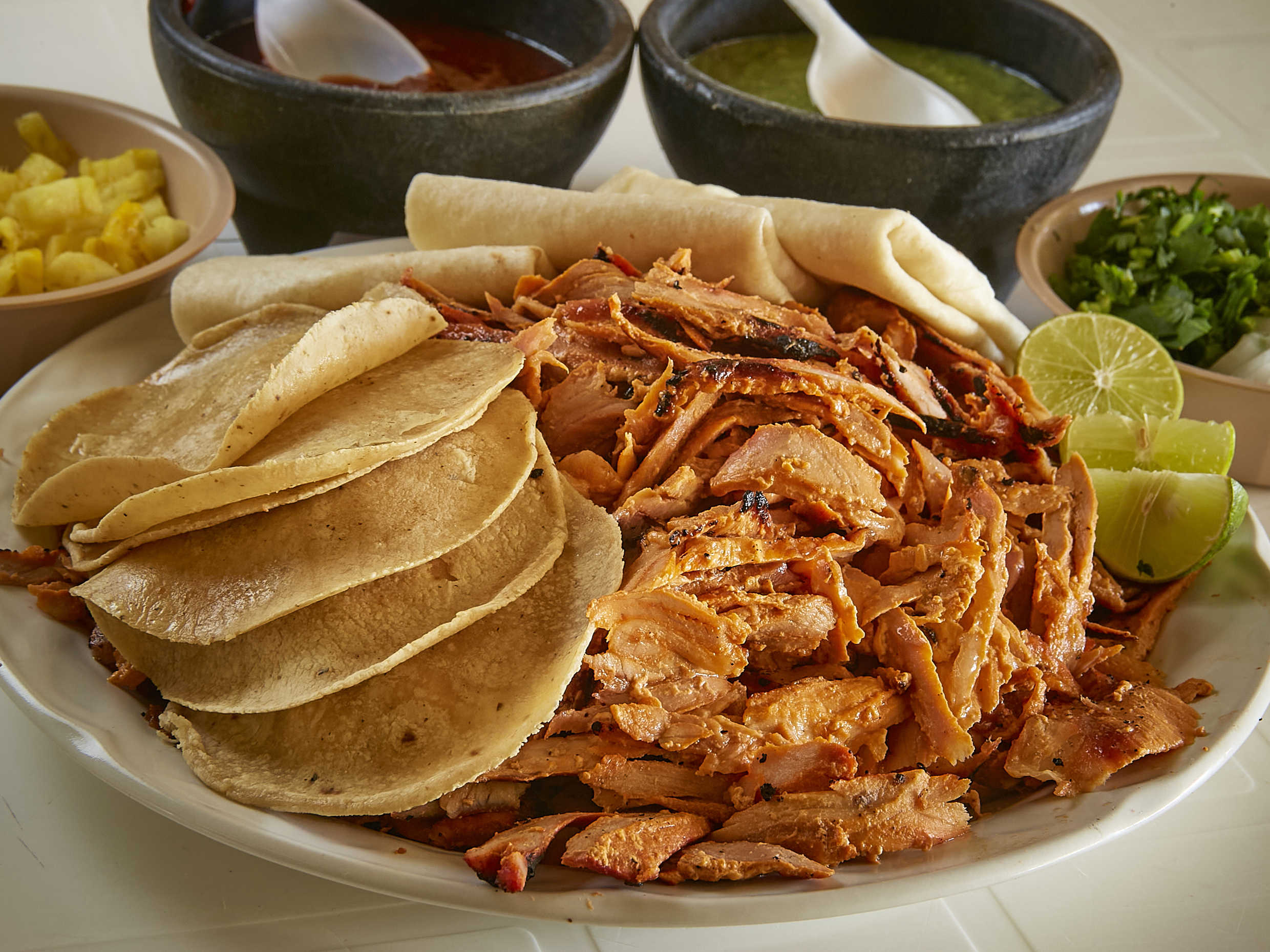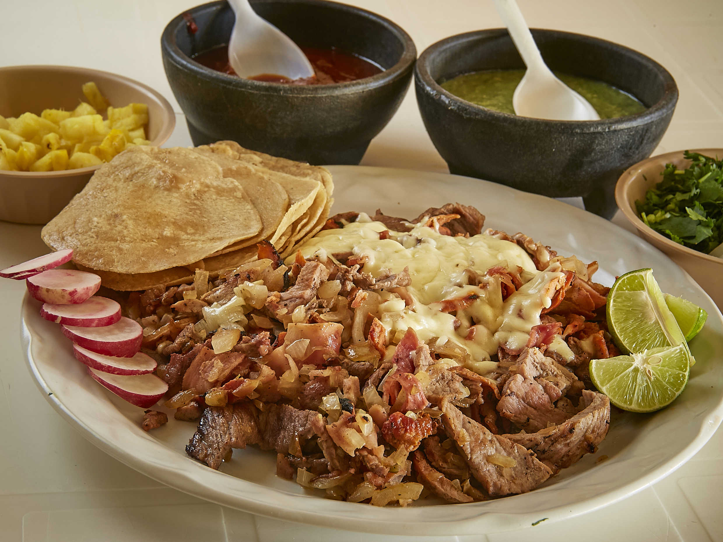 10 de tortilla de maiz, 10 tortillas de harina, cebolla, cilantro, salsa roja, salsa verde, limones, rábanos y piña. (5 a 6 personas)