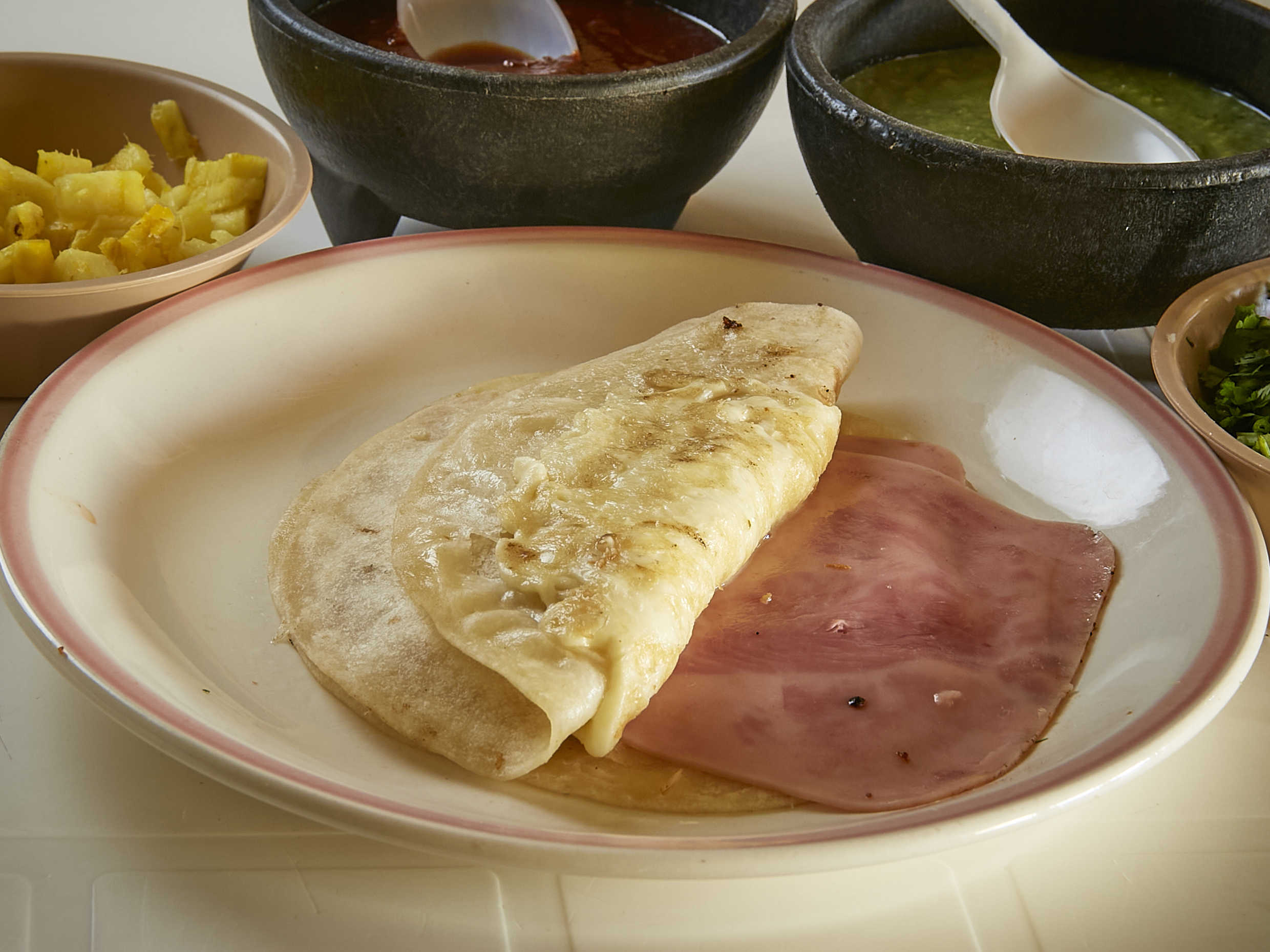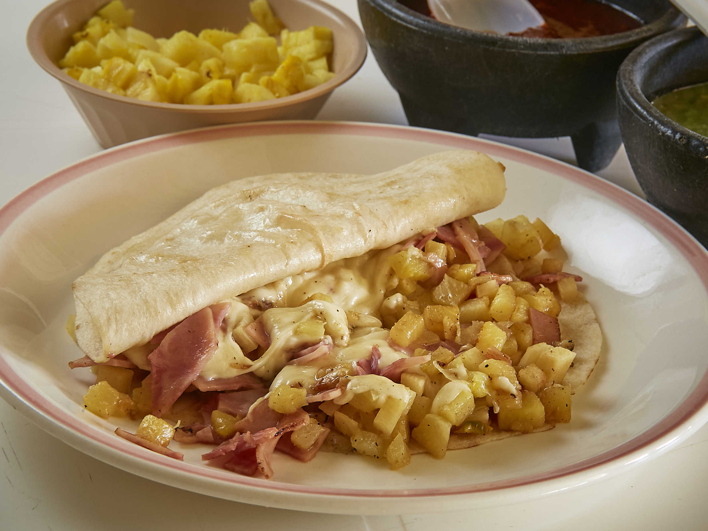 Dos tortillas de harina con jamón, piña y queso.