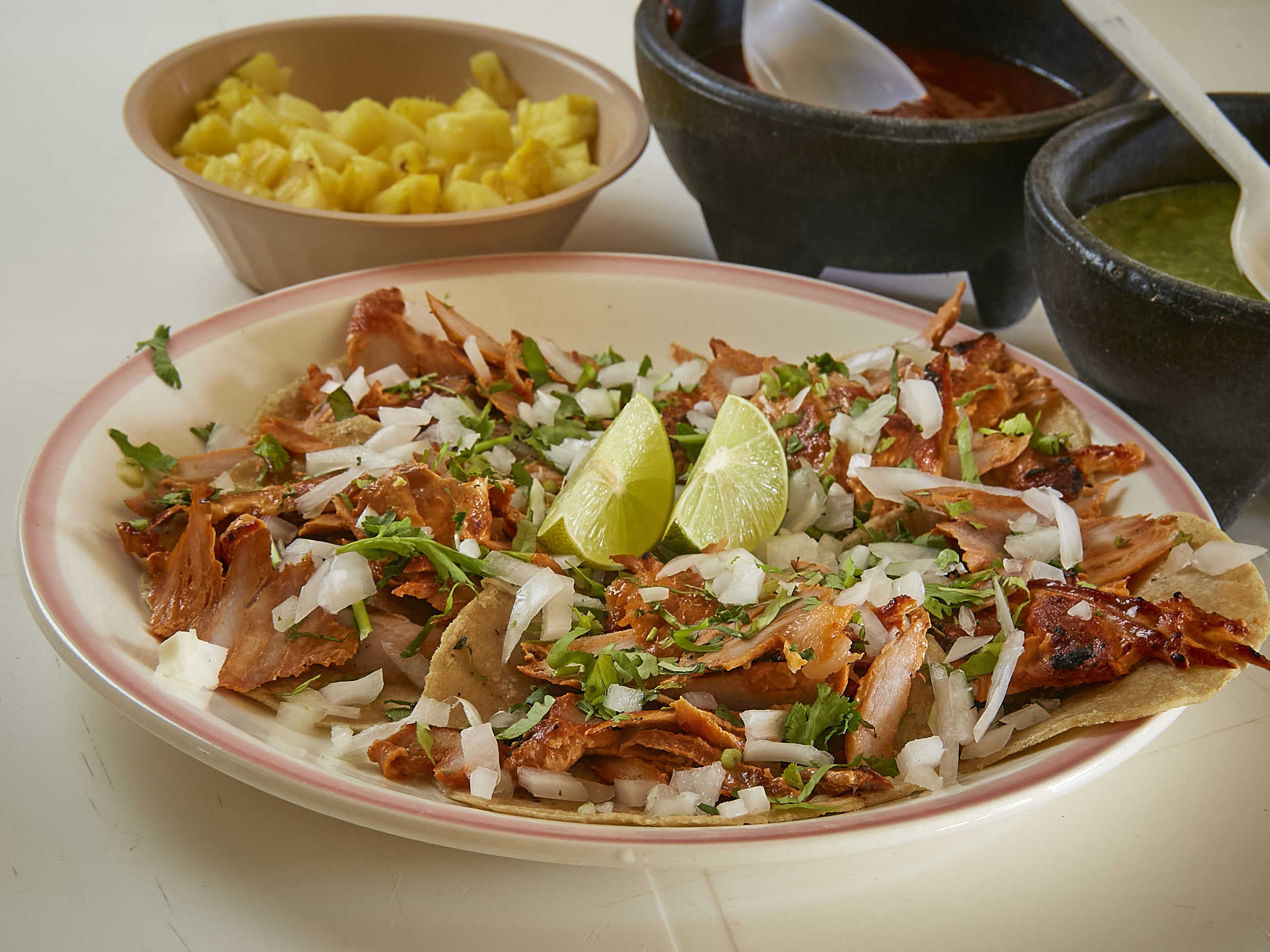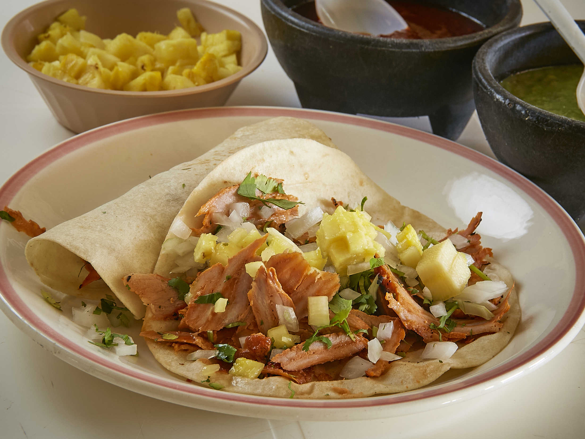 Incluye 3 tortillas de maíz, 3 tortillas de harina salsa verde y roja, cilantro, cebolla ycarne al pastor