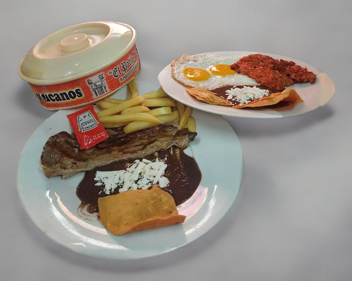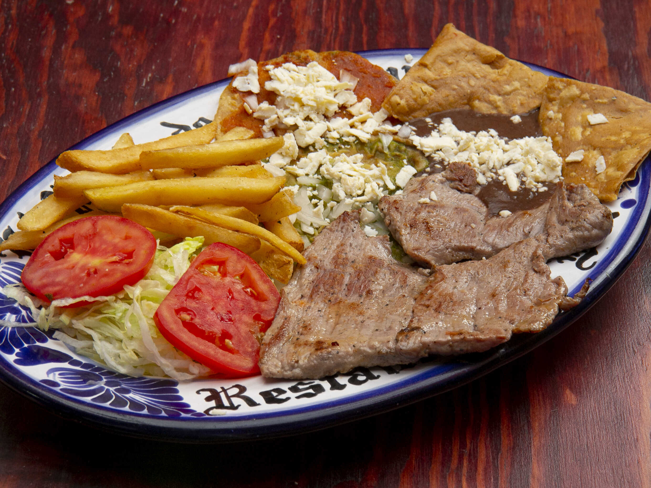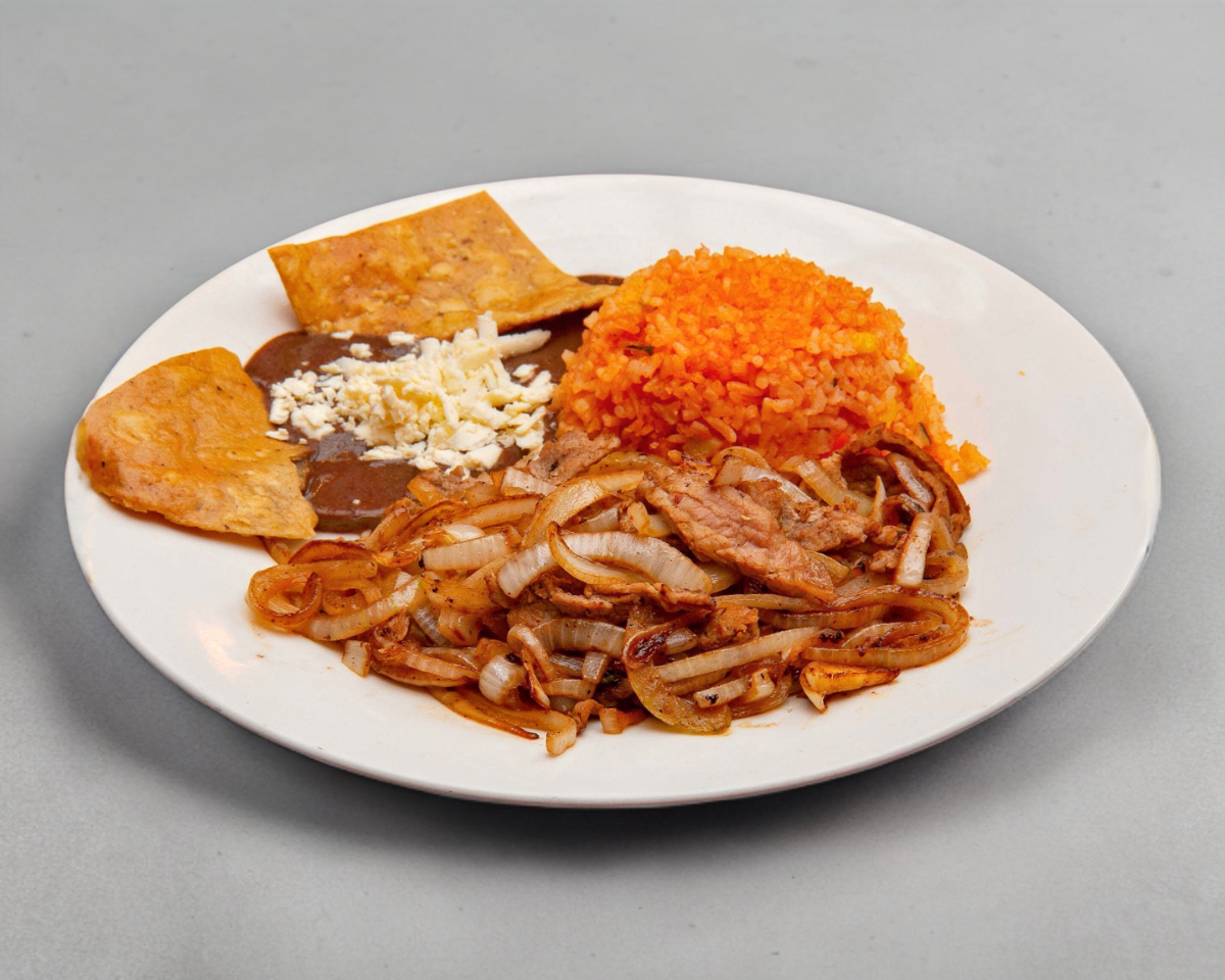 160 gramos de jugoso corte fino de res servido con chalupas, papas a la francesa, ensalada y frijolitos.
