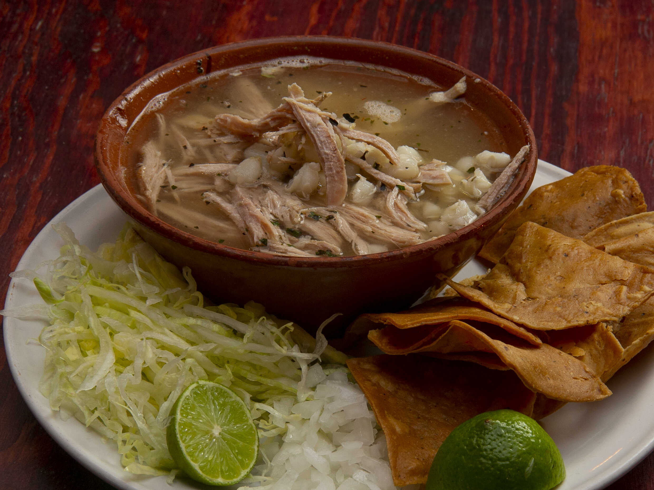 Con caldo de pollo, chipotle y queso gratinado.