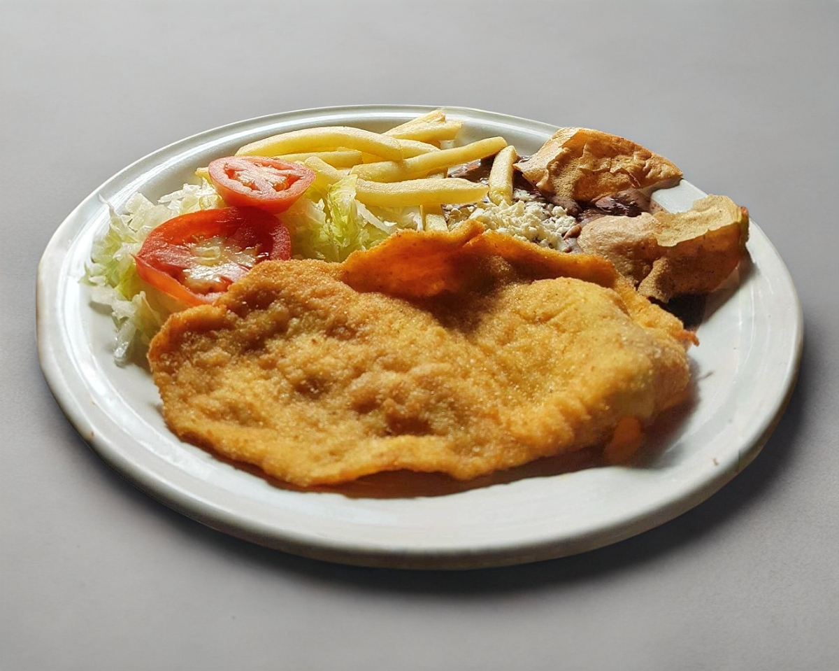 Milanesa de res personal, servida con papas a la francesa, ensalada y frijolitos.