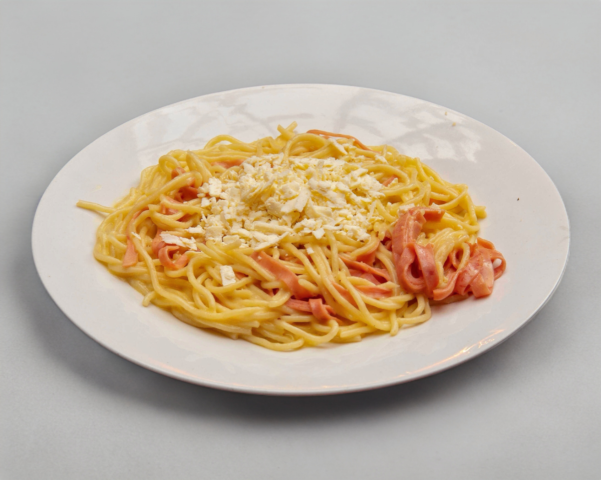 Espagueti Alfredo personal, 120 g de pasta con crema, queso y jamón de pavo.