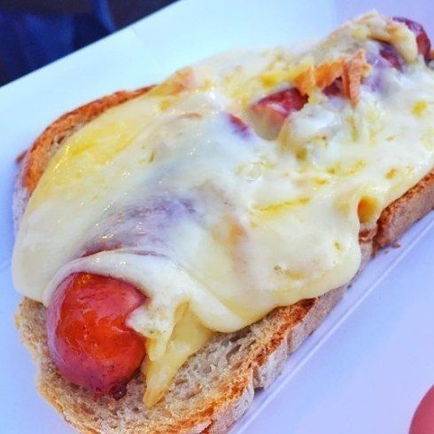 Pan jumbo, Salchicha jumbo, mayonesa, gratinado con quesp gouda, catsup.