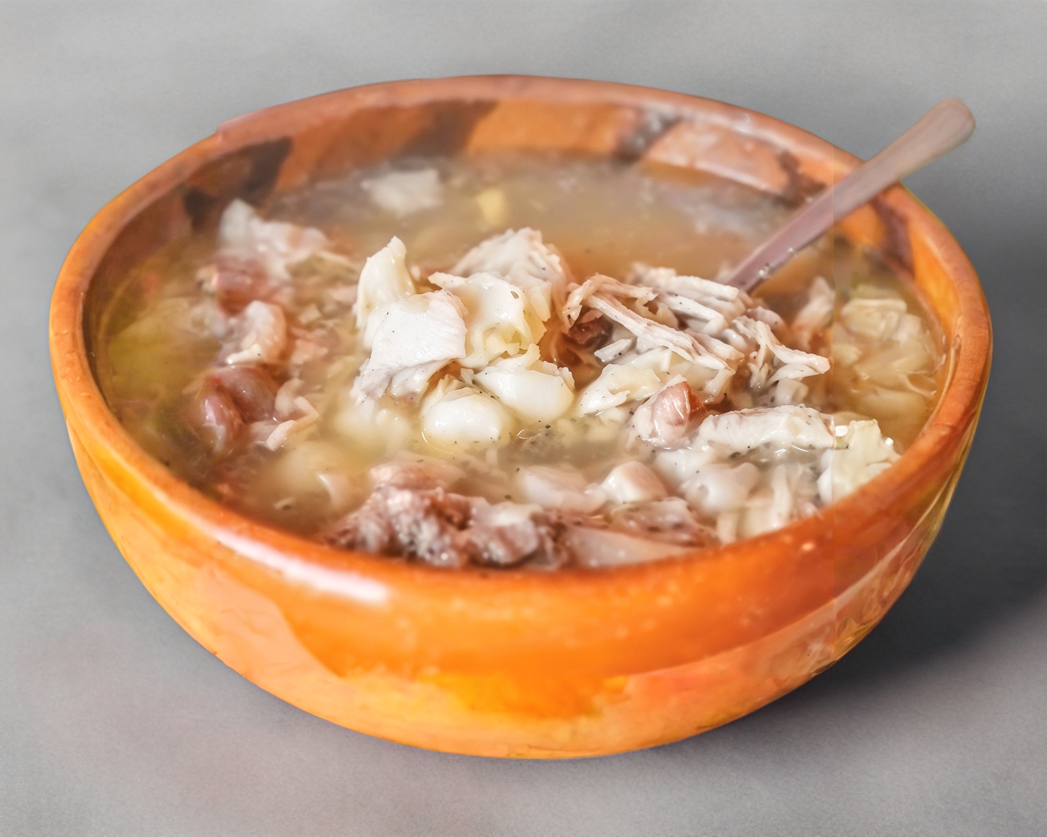 Pozole blanco Acompañado de lechuga rabano limon tostadas oregano y chile