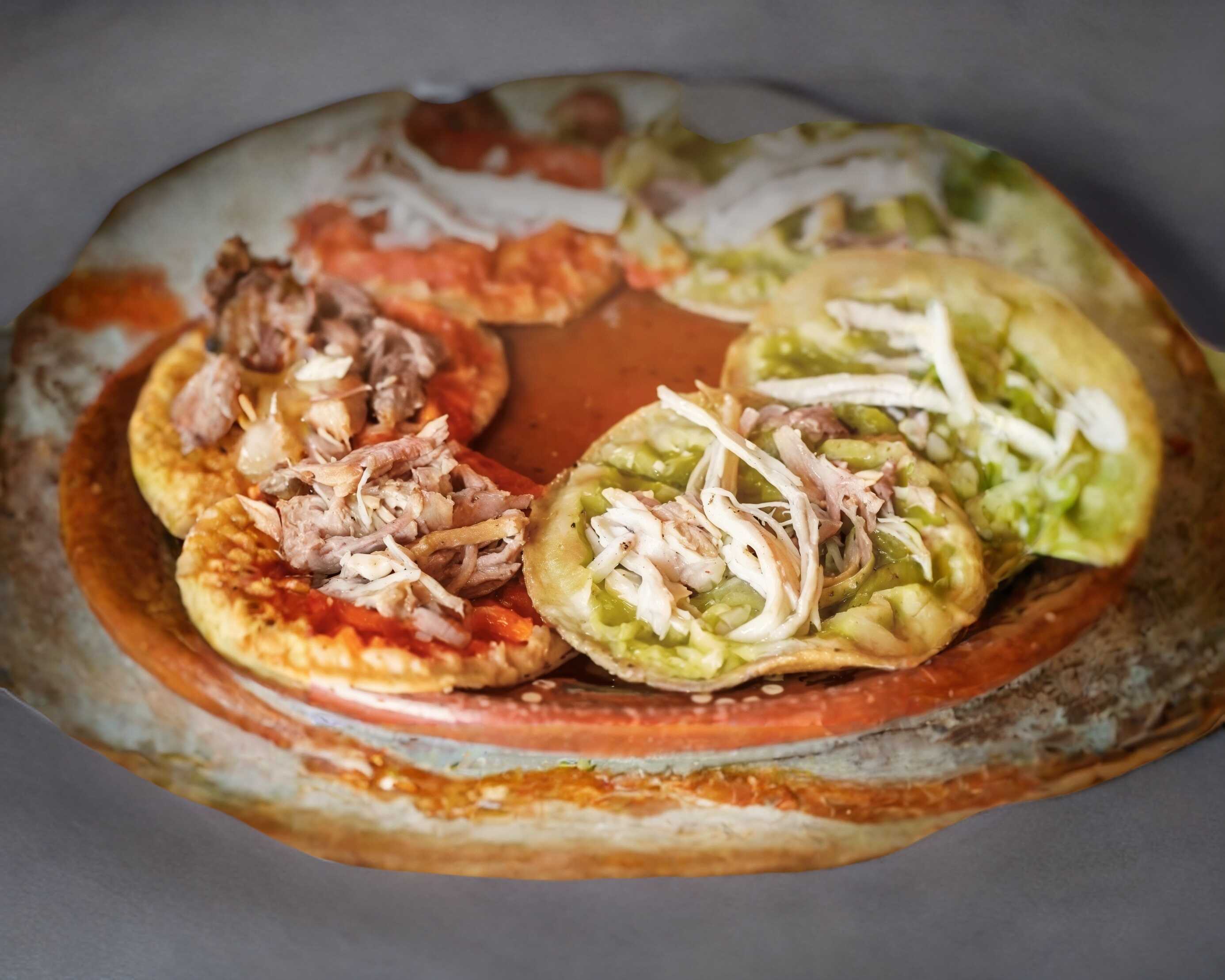 Dos picaditas rojas y dos verdes con cebolla pollo y queso