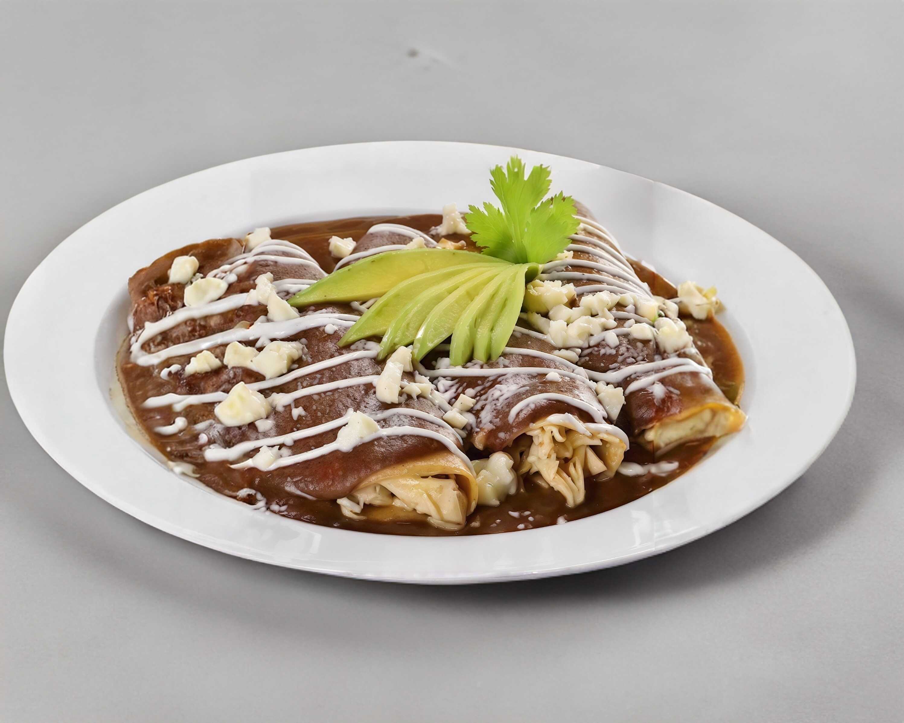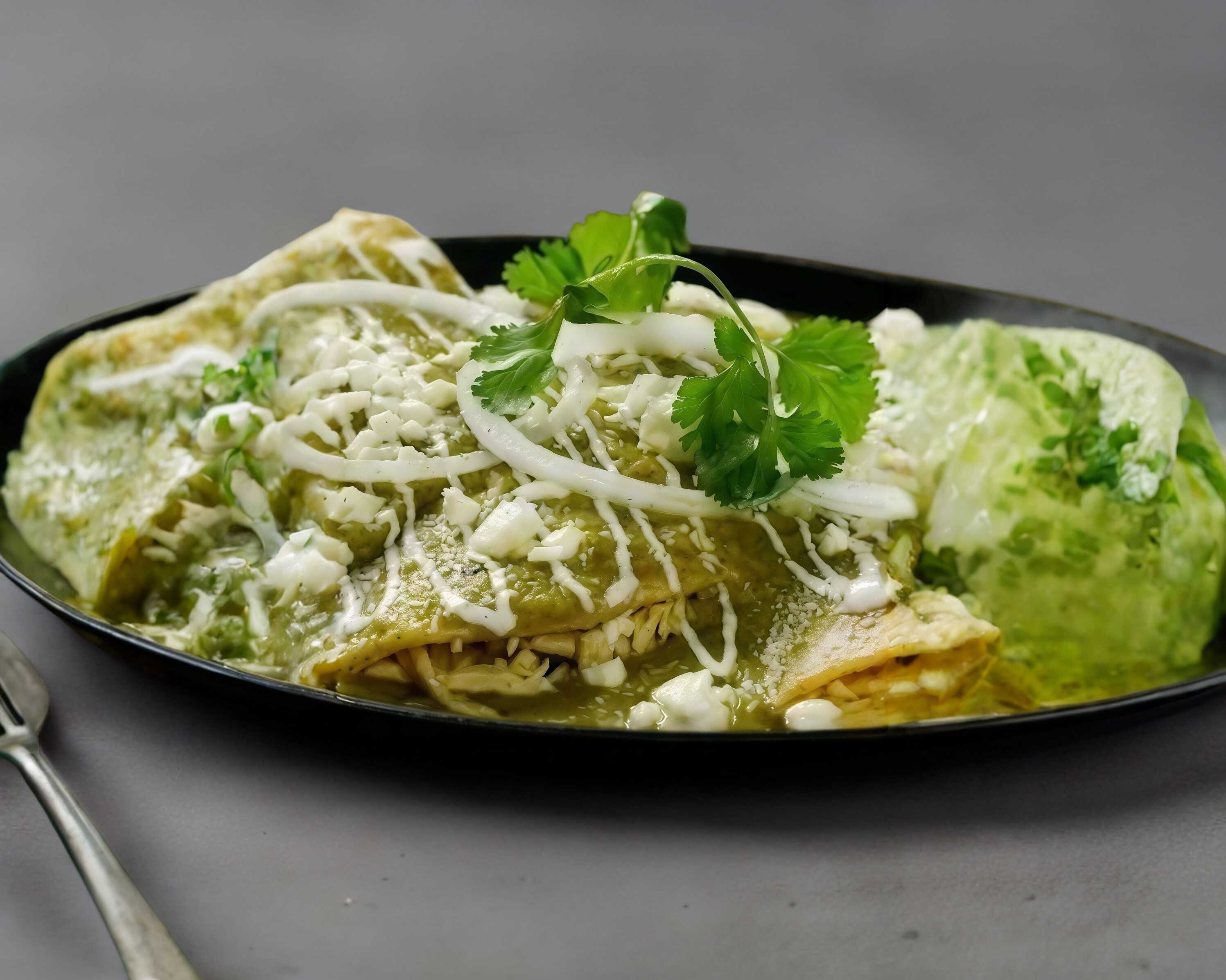 Tres enchiladas rellenas de pollo con crema cebolla y queso