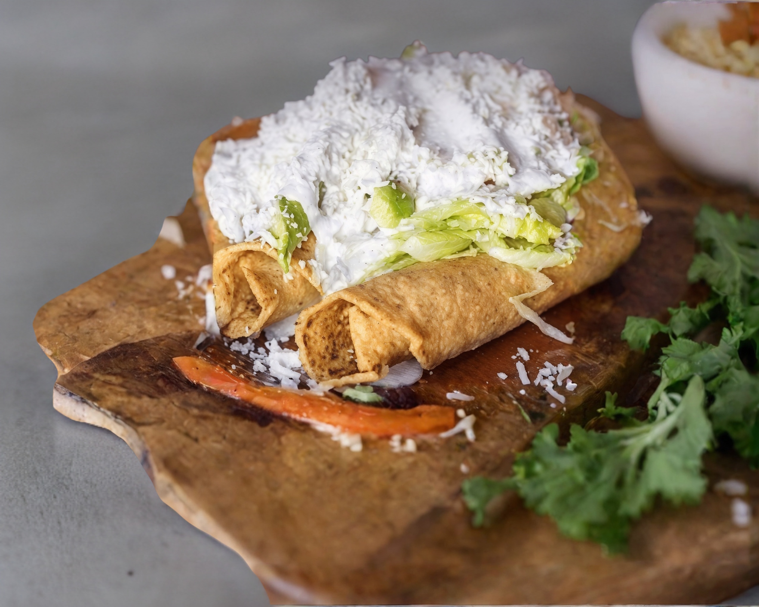 Tres flautas rellenas acompañadas con lechuga crema aguacate y queso