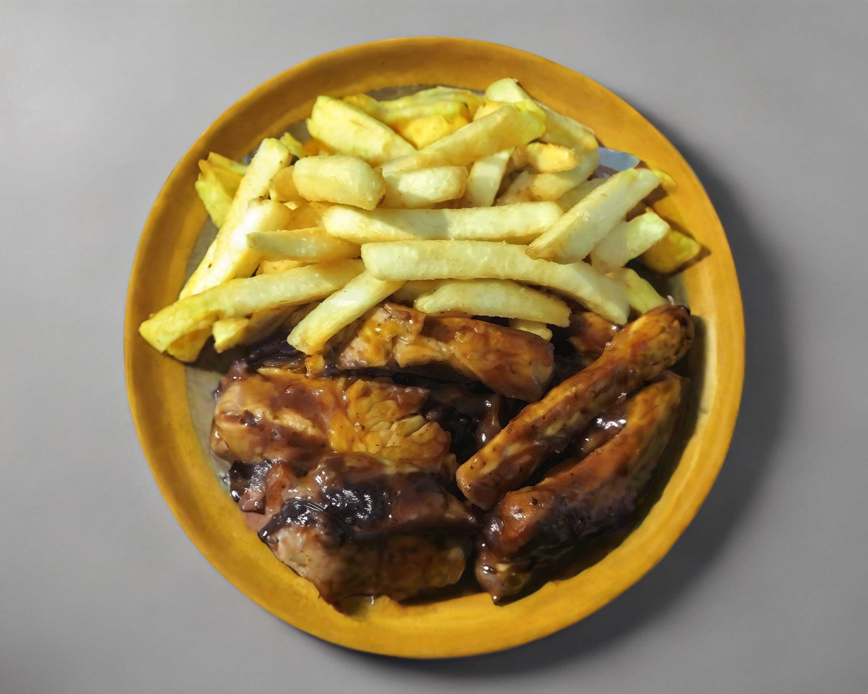 Carnitas Bañadas con salsa BBQ y papas a la francesa