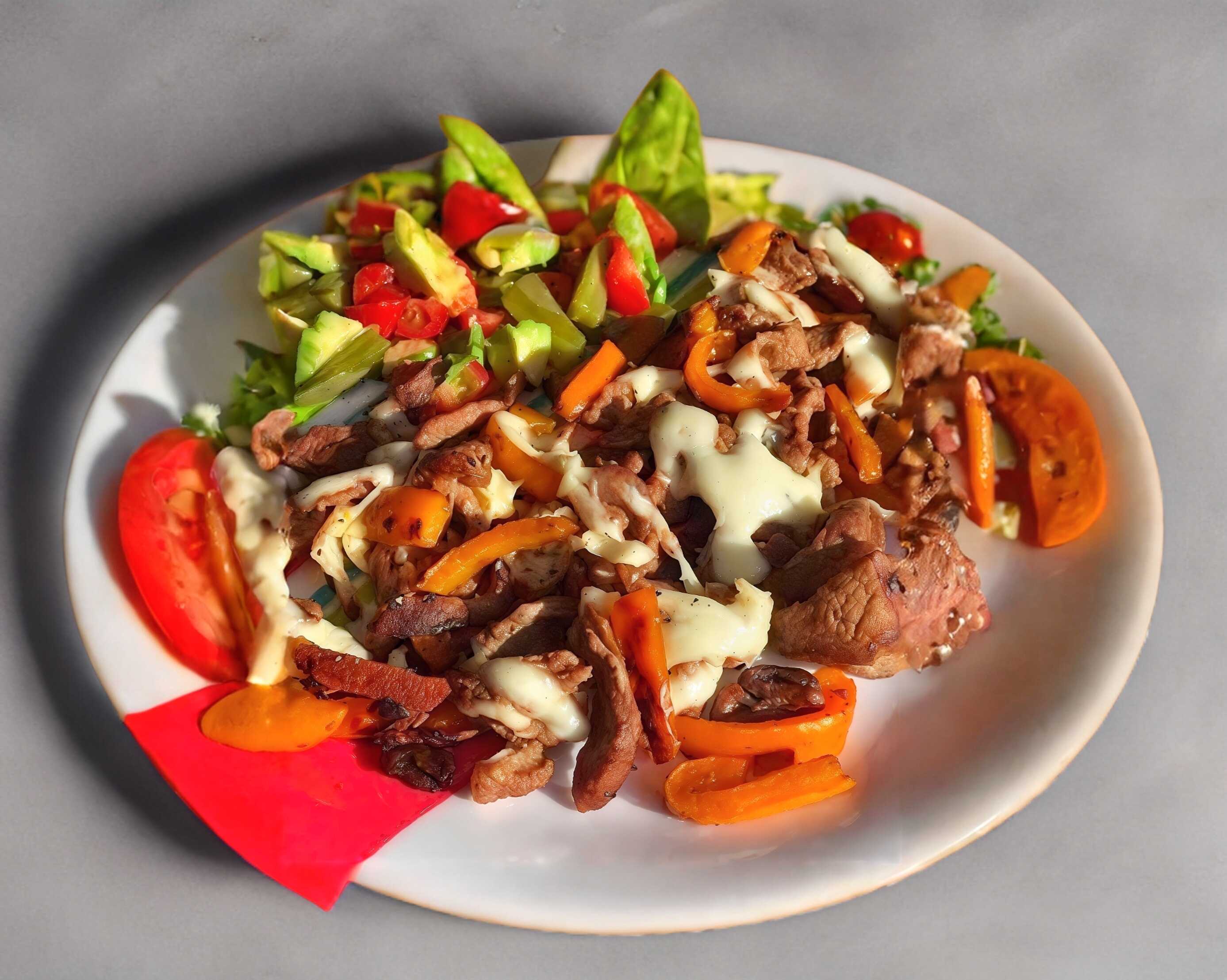 Mezcla de carne, tocino, pimientos, cebolla y queso.