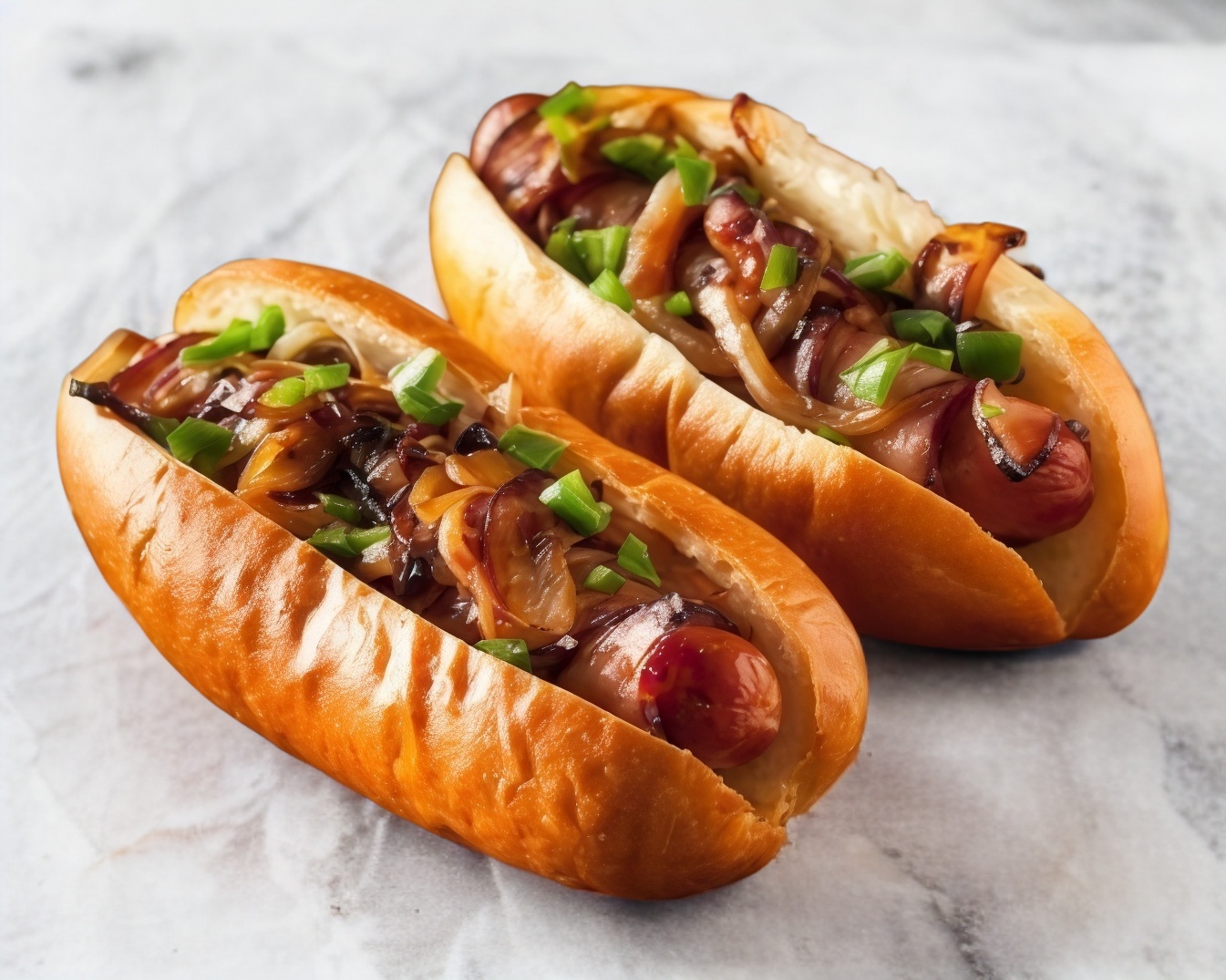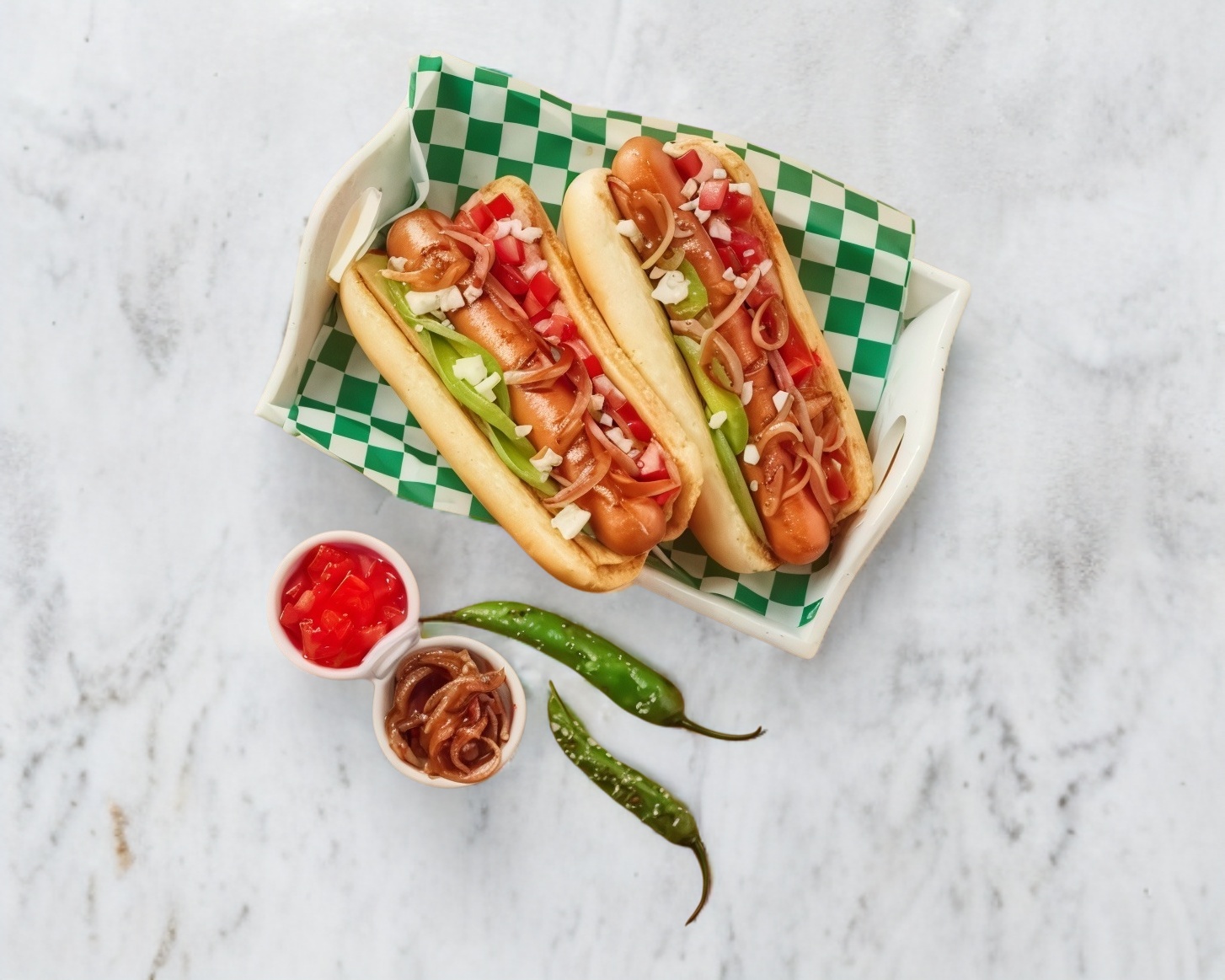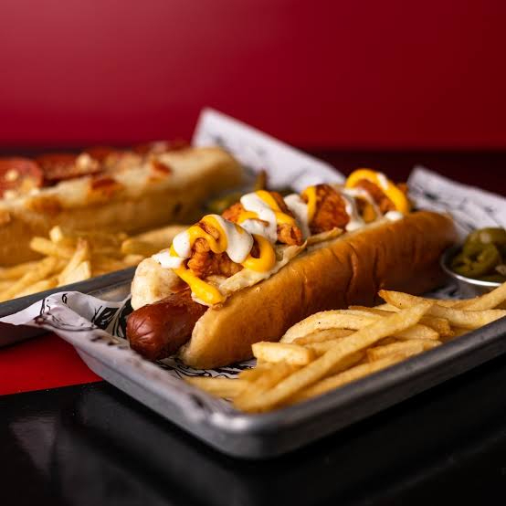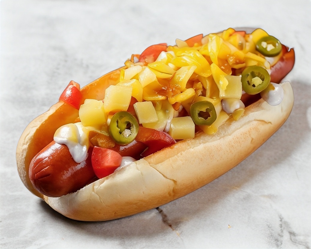 Pan de hotdog salchicha jitomate cebolla adereso blue cheese y mango habanero