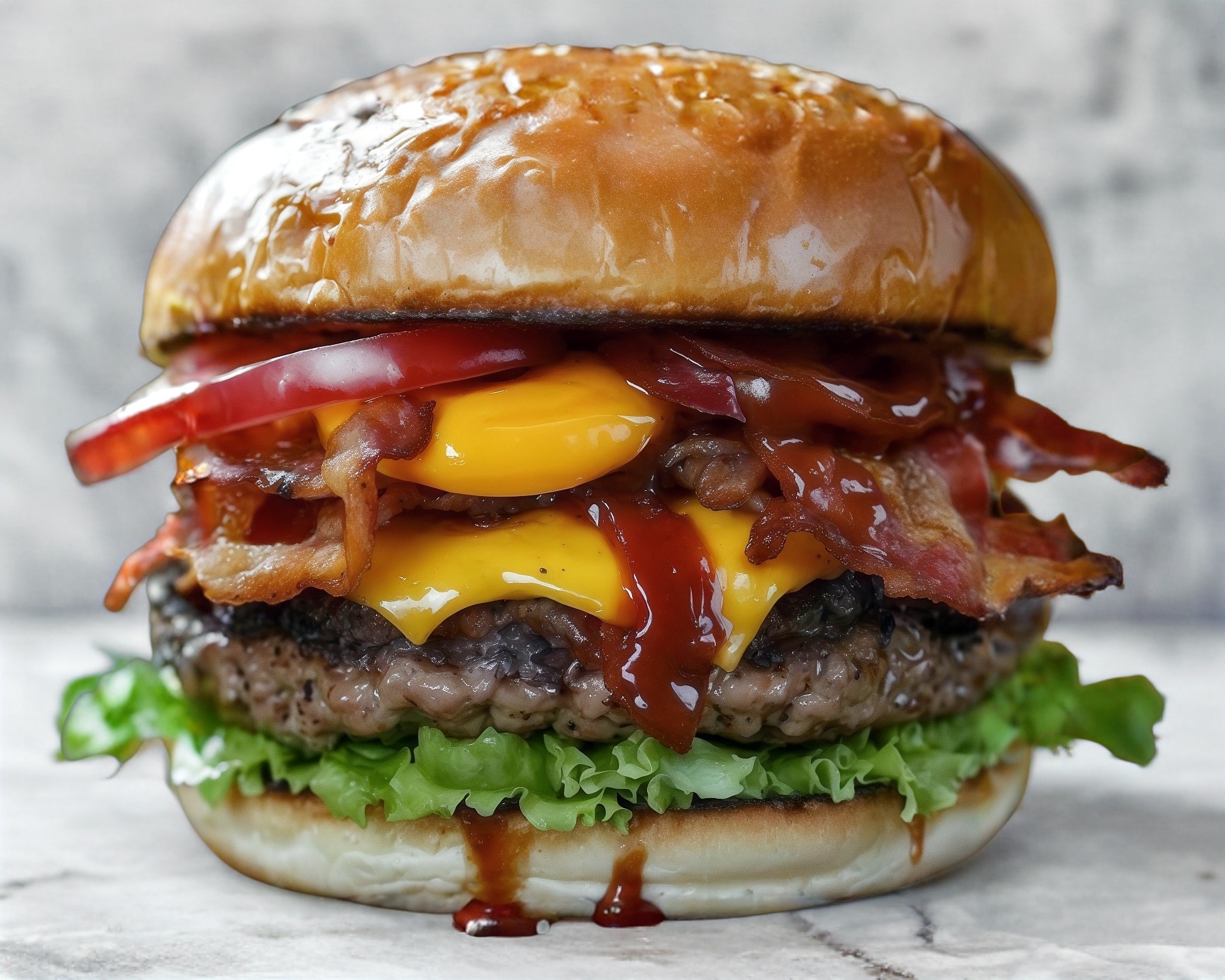 Llevar pan para hamburguesa, carne de hamburguesa, tocino, aderezo BBQ,jamón, queso manchego, jamón salchicha lechuga, tomate, cebolla, ketchup y mostaza