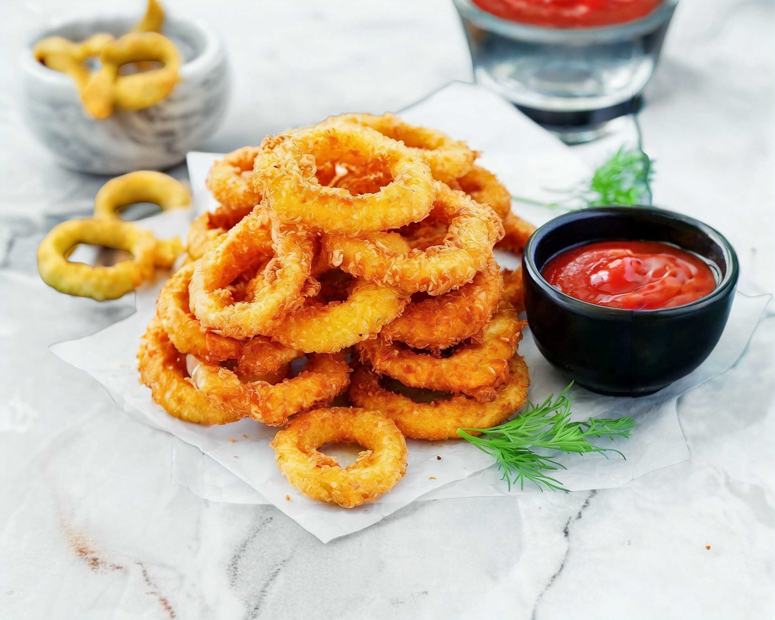 Seis piezas de aros de cebollas a compañado con salsa y ketchup