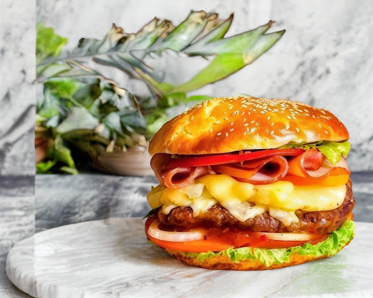 Pan para hamburguesa, carne preparada, lechuga romana, rodaja de jitomate, cebolla, queso americano, jamón americano, catsup, mostaza, mayonesa y tiras de tocino.