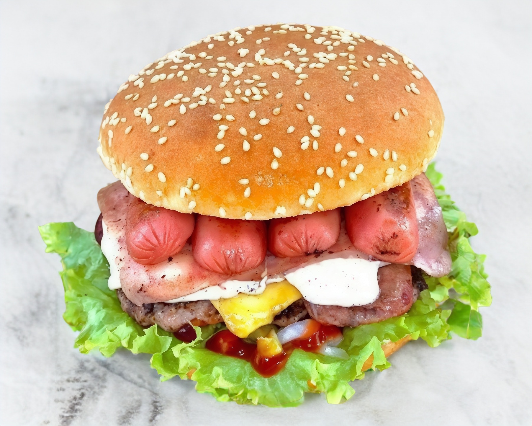 Pan para hamburguesa, carne preparada, lechuga romana, rodaja de jitomate, queso americano, jamón americano, queso manchego, catsup, mostaza, mayonesa., salchicha frita y tiras de tocino.