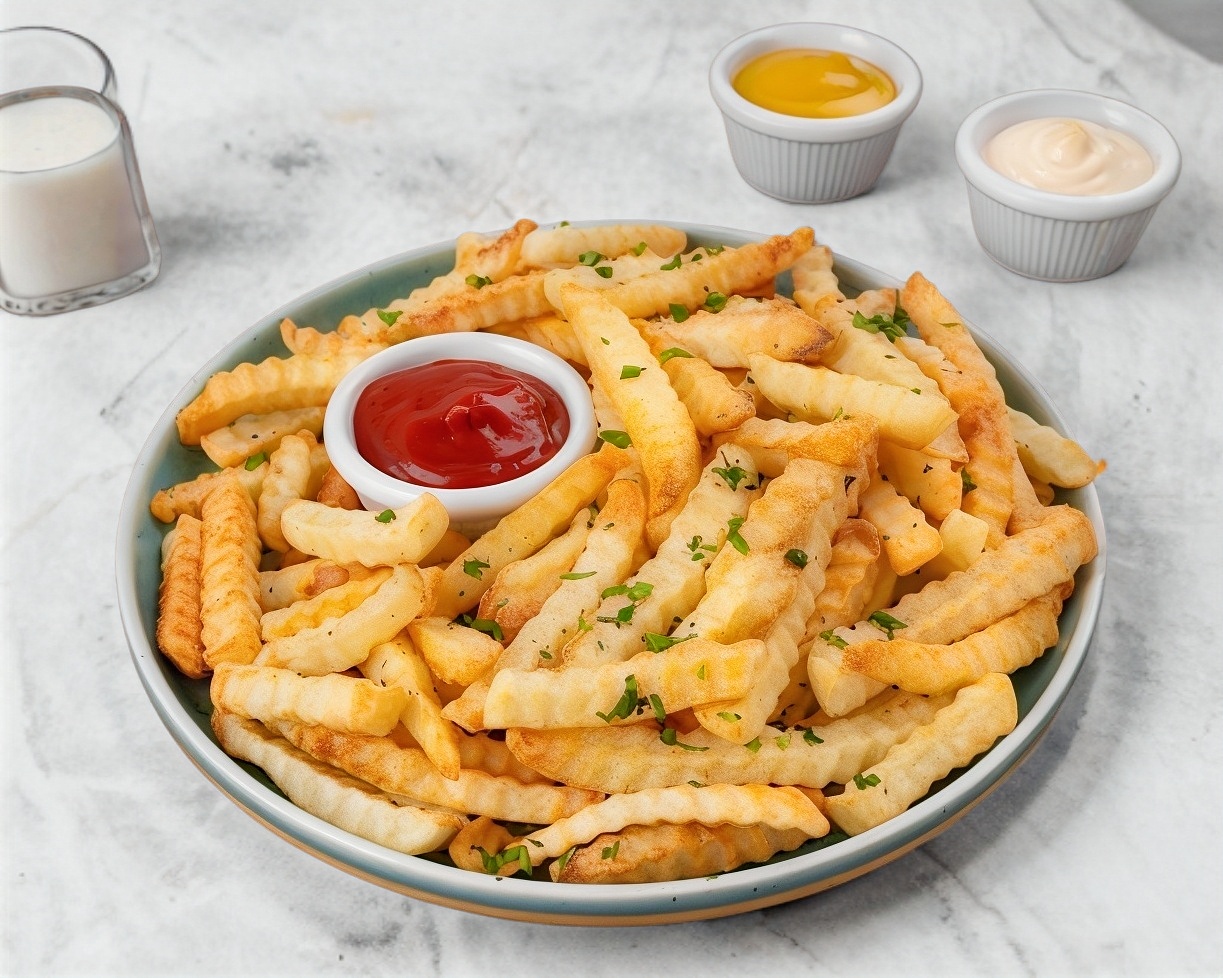 Papas fritas 200 g salchicha corte pulpo aderezo de ketchup salsa picante queso amarillo