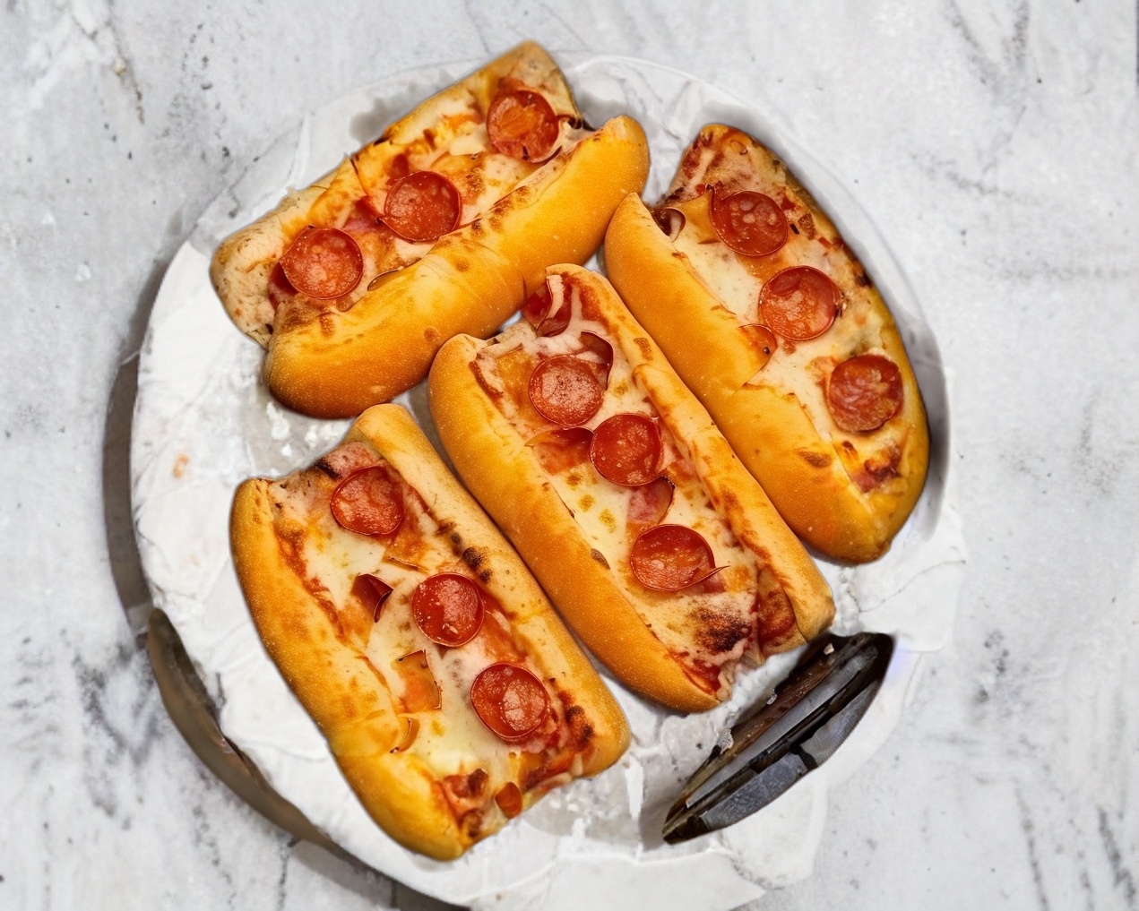 Pam de hotdog, salchicha hotdera, queso mamchego, peperoni, ketchup y mostaza