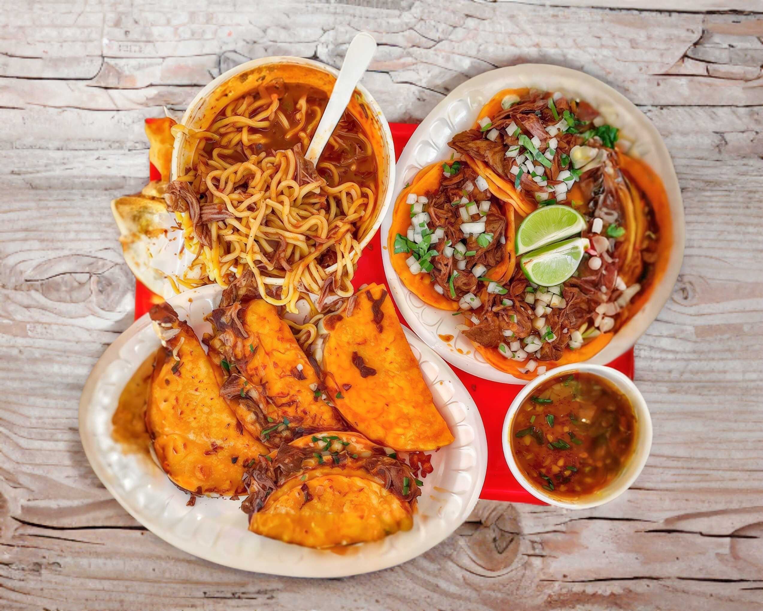 1 maruchan birria, 4 tacos sencillos, 4 quesabirrias, 1 consome.