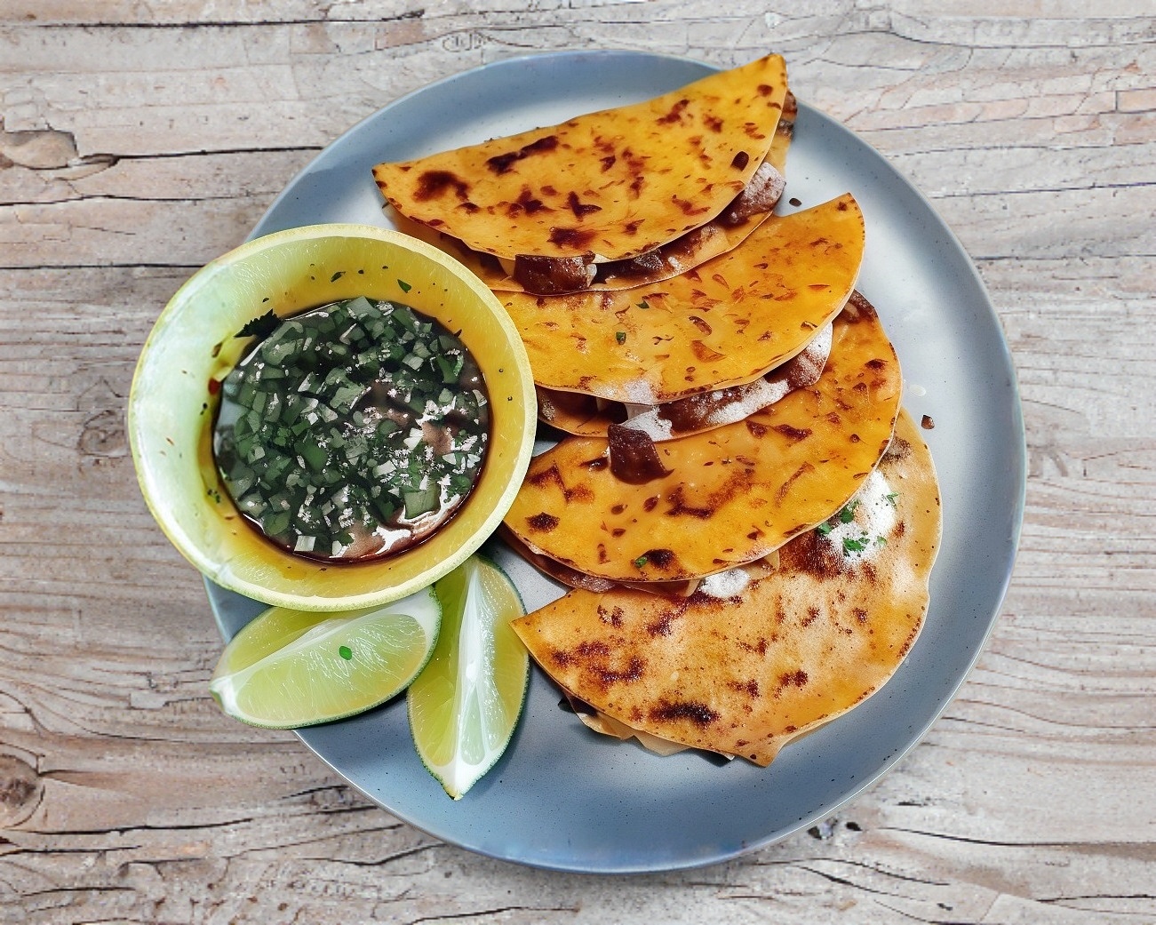 2 Quesa birria de harina acompañadas de consome.