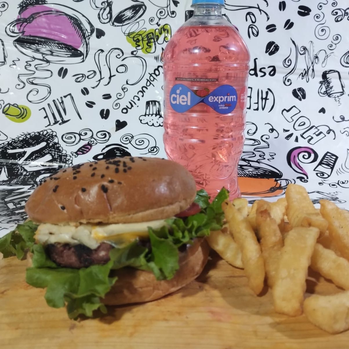1 Pieza de carne de aracherra, queso amarillo, queso manchego, lechuga italiana, jitomate, cebolla morada, pepinillos, 180 g de papas a la francesa y agua de sabor 1 litro.
