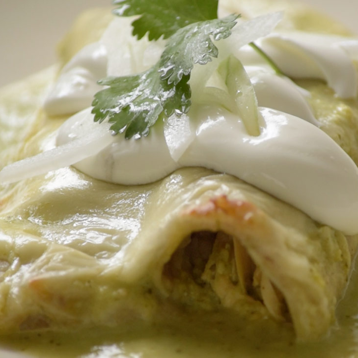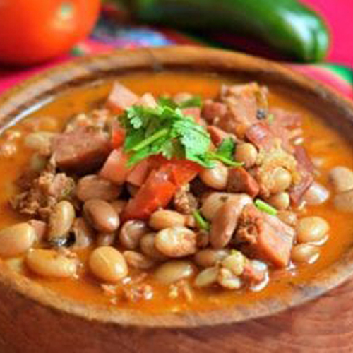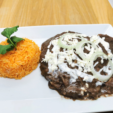 Fajitas de pollo a la mexicana con frijoles refritos y arroz..