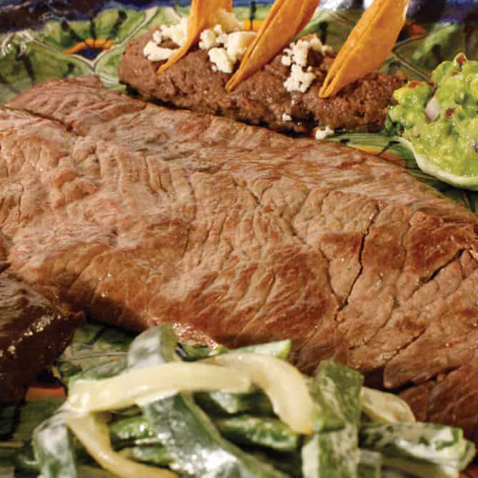 Carne asada de res, una enmolada, nopales asados y frijoles refritos.