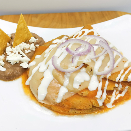 Enchiladas con huevo, frijoles refritos, arroz y fruta sola 120gr.