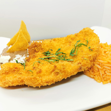 Pechuga de pollo a la plancha, con arroz y frijoles.