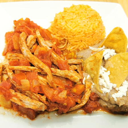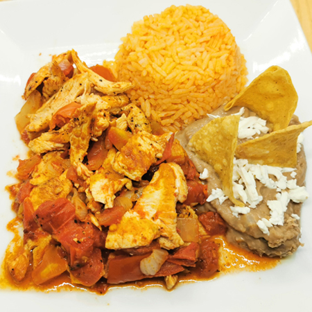 Fajitas de pollo a la mexicana con frijoles refritos y arroz..