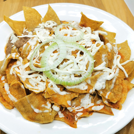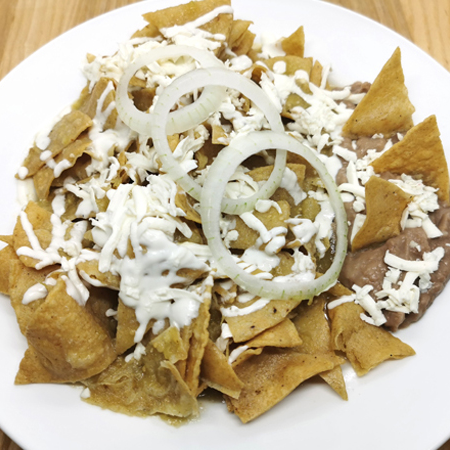 Chilaquiles c/huevo, frijoles refritos, arroz y fruta sola 120gr.